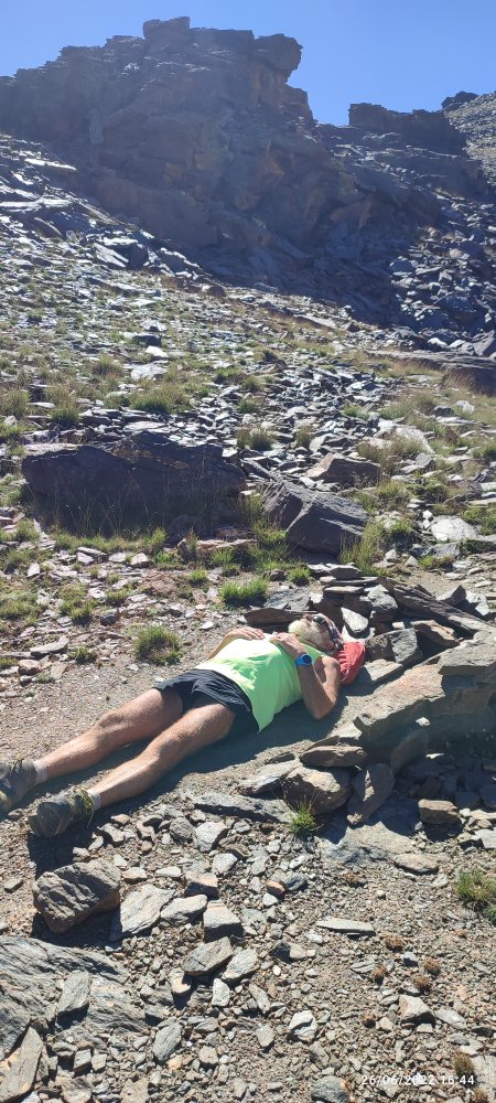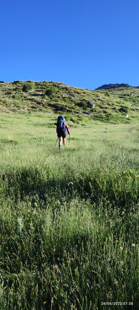 Après ce quatrième sommet à plus de 3000, je ne me sent pas de gravir la pente vertigineuse de celui qui nous attend. Je ressent la fatigue, un besoin de plus en plus fréquent de micro halte pour retrouver le souffle et en plus mon estomac hurle famine; je pense qu’il est temps que notre journée se termine. Nous sommes au collado de Vacares et un peu avant la lagune du même nom…