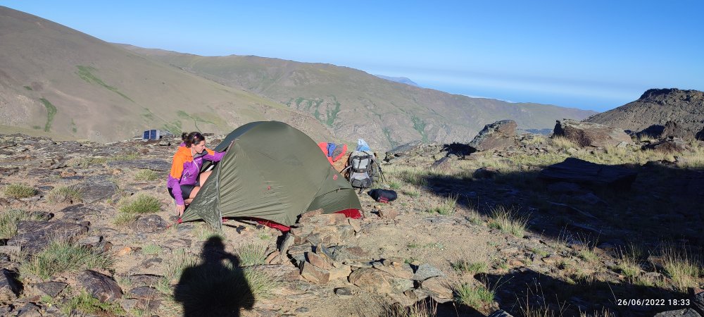 Je remarque en contrebas des amas rocheux où il doit bien avoir une plate forme pour la tente et tout proche deux sources facilement repérables à l’herbe verte qui pousse autour. Laetitia est d’accord quand je lui propose l’idée de nous arrêter et de chercher le lieu de bivouac.