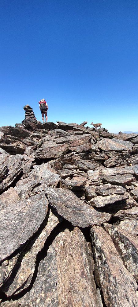 Il nous faudra plus d’une heure pour l’atteindre ce sommet, aucun sentier en vue, nous marchons d’objectif rocheux en objectif rocheux. De plus ces montagnes sont taquines, on aperçoit un sommet et satisfait nous nous disons nous y sommes presque. L’objectif atteint, un autre sommet apparait qui n’est toujours pas le vrai sommet.