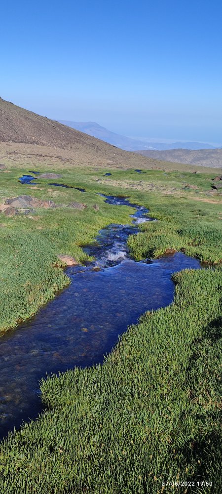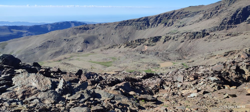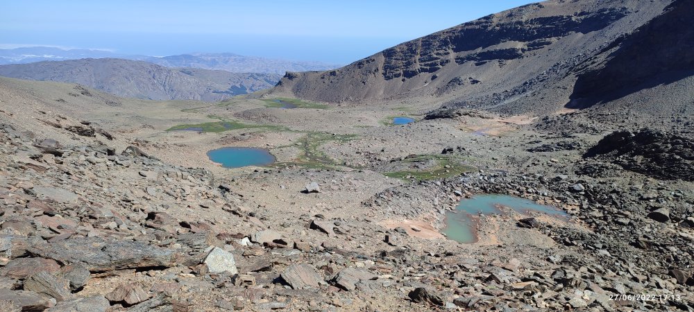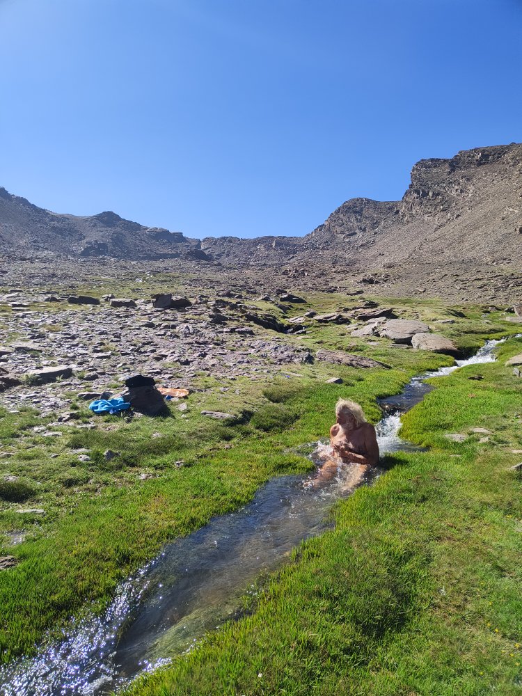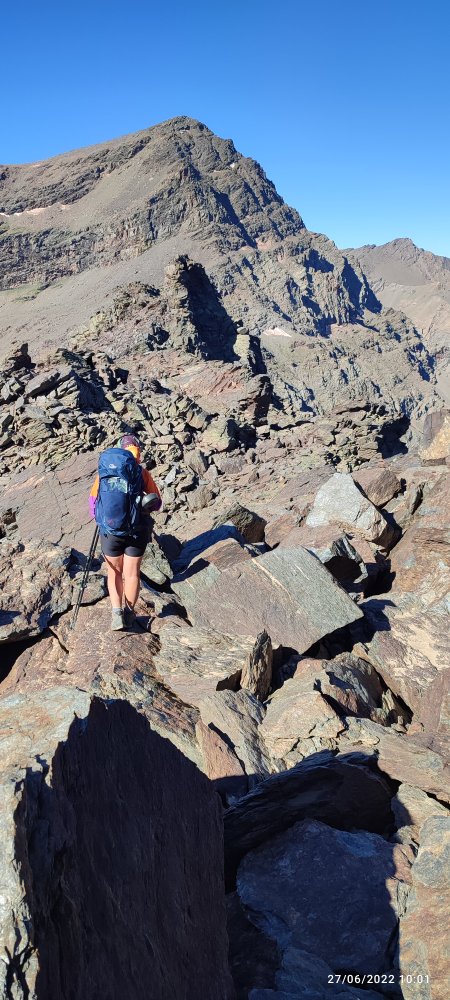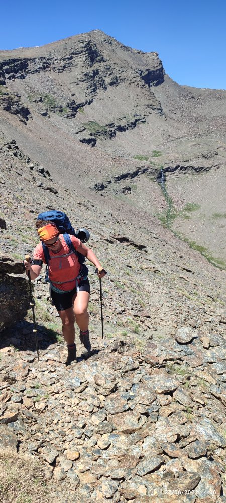 Arrivés aux lagunes de Vacares, un peu fatigués, nous effectuons notre pause repas. Nous économisons un peu la nourriture, car nous avions prévu deux bivouacs et là, il est évident que nous allons être amenés à en faire trois. Ou bien abandonner l’escalade du Mulhacen, mais cette idée ne parvient pas jusqu’à notre esprit.