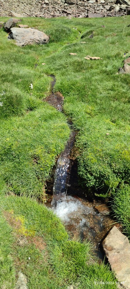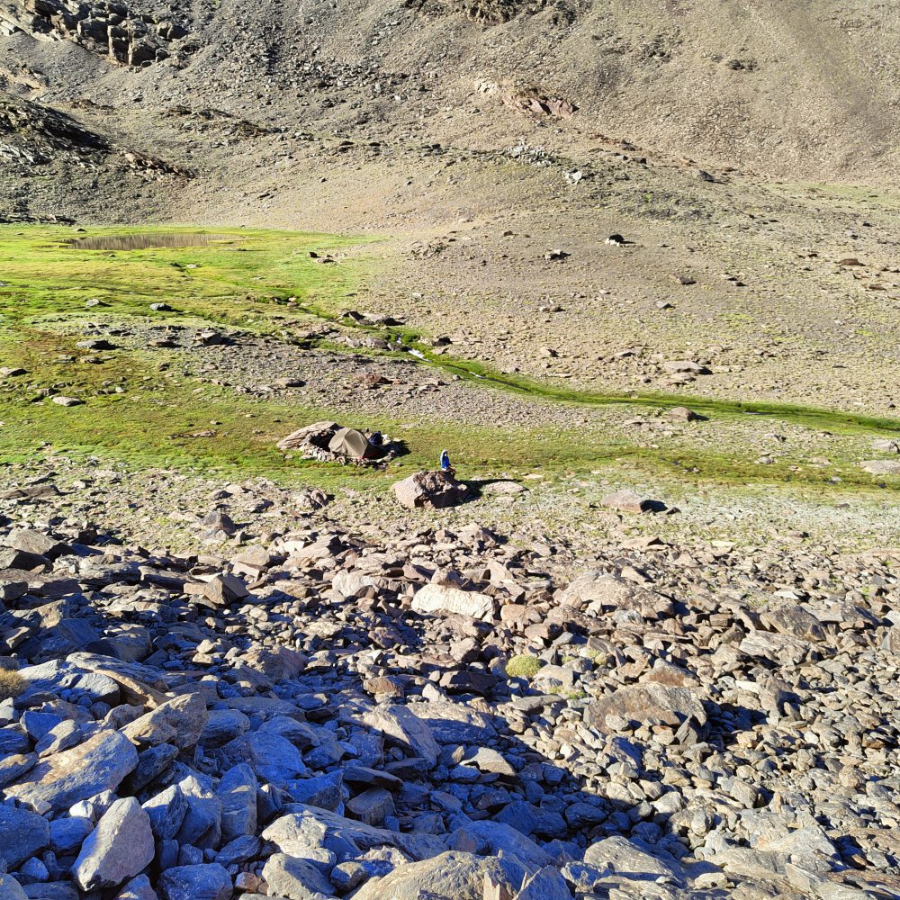 De loin nous observons où nous pourrions poser notre cabane pour la nuit, cela ne va pas être simple. Entre les rochers, le terrain pierreux et nous ne construisons pas de grands espoirs avec la verdure qui doit être un secteur bien humide.