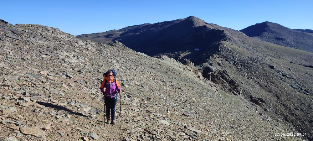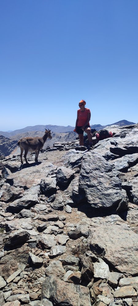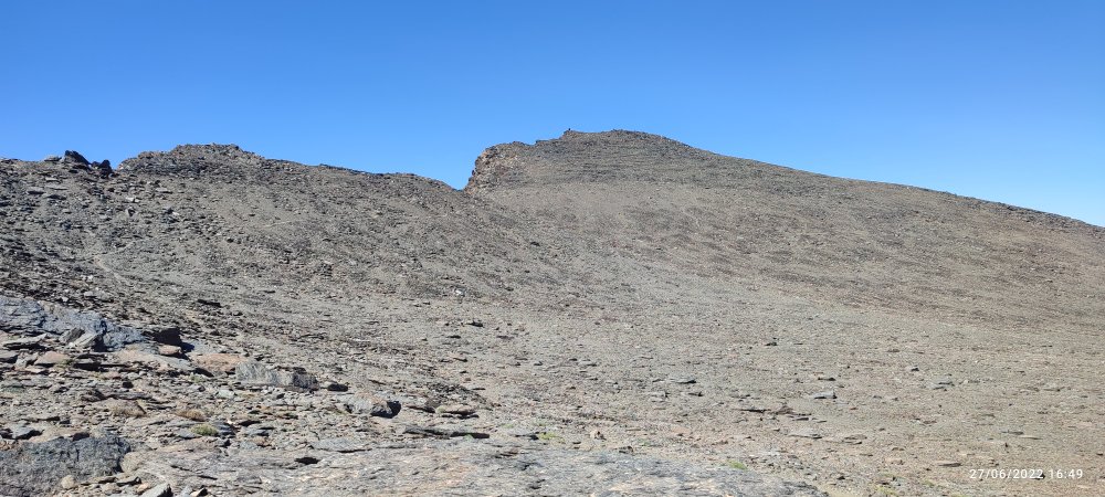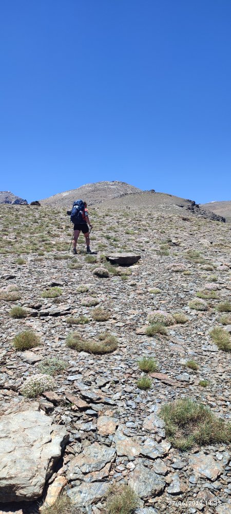 Nous retrouvons nos deux conseillers Espagnols et un couple qui casse la croute. Il y a un peu de monde, c’est un signe que l’on se rapproche du maître des lieux le sommet des sommet, le Mulhacen.