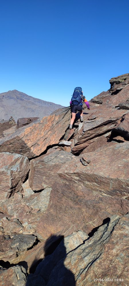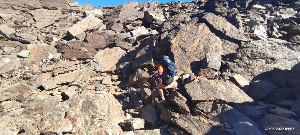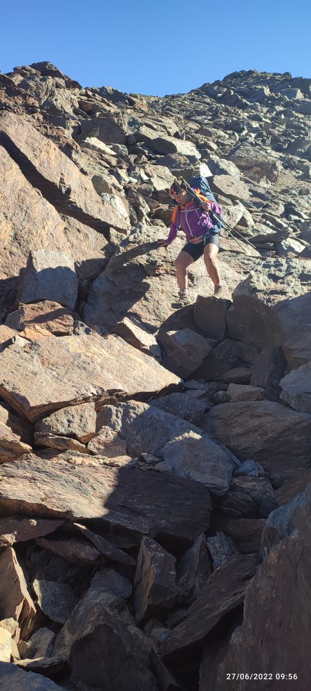 Nous évoluons dans des éboulis de roche qui sont heureusement presque toutes stables, restons quand même vigilants. Si nous sommes souples, nous ne sommes pas des chamois !