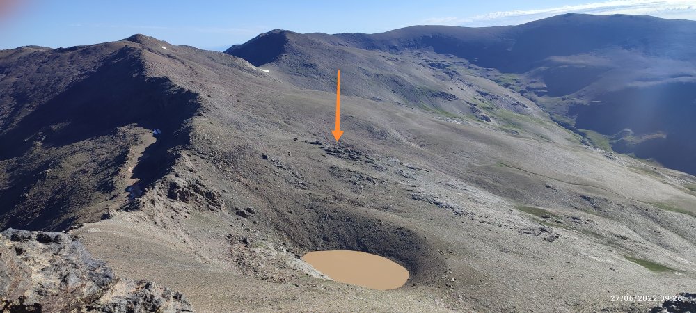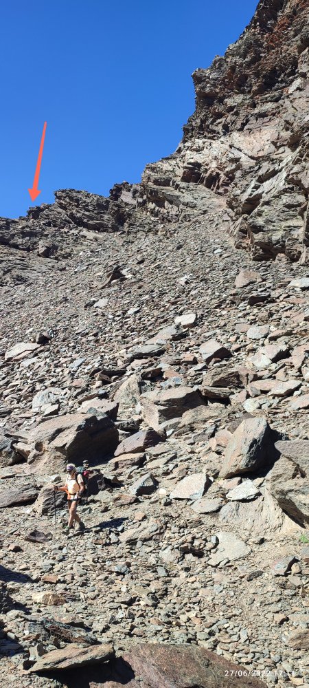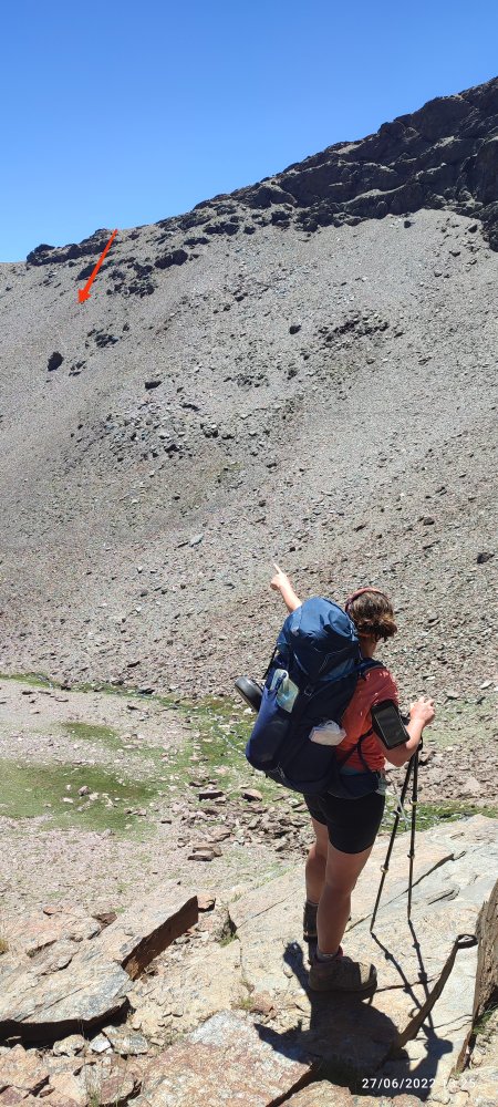 Les flèches, sur la photo ci-dessous, indiquent notre descente depuis la crête.