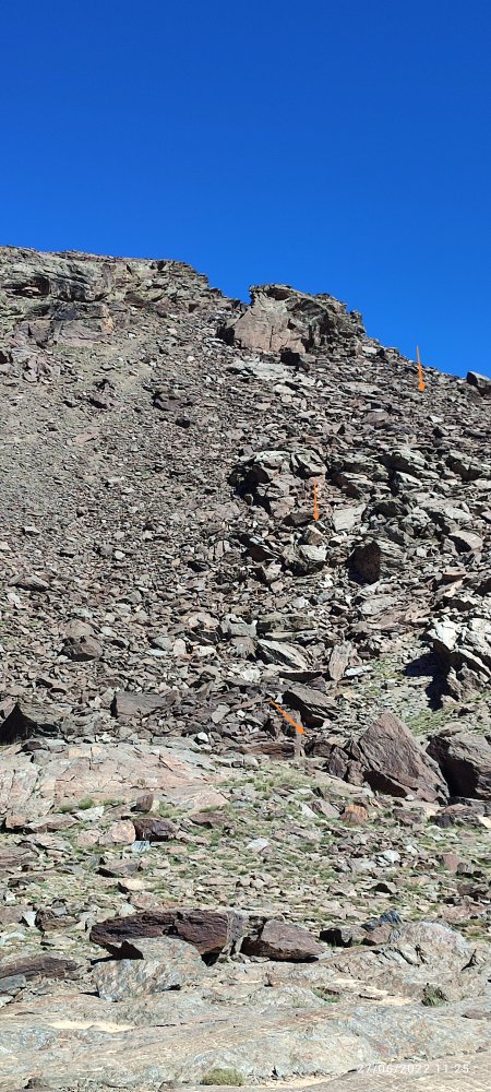 Dans la montée très raide qui se trouve face à nous se dessine un semblant de sentier et effectivement des cairns nous guide. Démarrer à froid avec un dénivelé de 200 mètres dans de la pente très raide, les muscles ont un peu de mal à digérer la violence de l’effort.