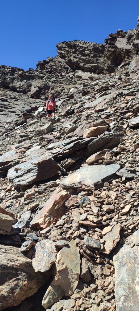 Ces deux randonneurs qui ont le pas allègre, me font évaporer tout sentiment de déception d’avoir évité un sommet de 3000. Ils ont fait la traversée de tous les plus de 3000, sans redescendre à l’inverse de nous.