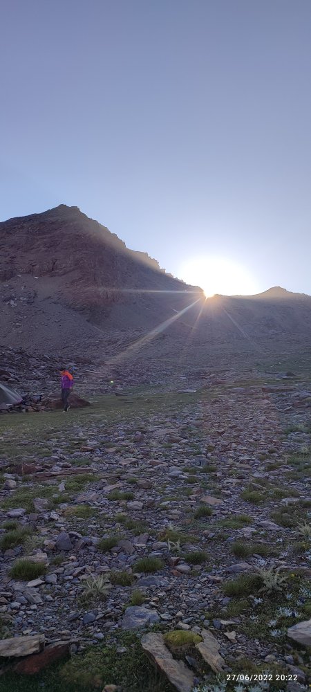 Nous cherchons remarquons que nos collègues espagnols se sont déjà trouvés un petit coin au sec. Nous voyons bien quelque place, mais bien souvent humide ou encore en pente. Nous finissons par trouver un lieu derrière une grosse roche qui a déjà du servir de point de bivouac.