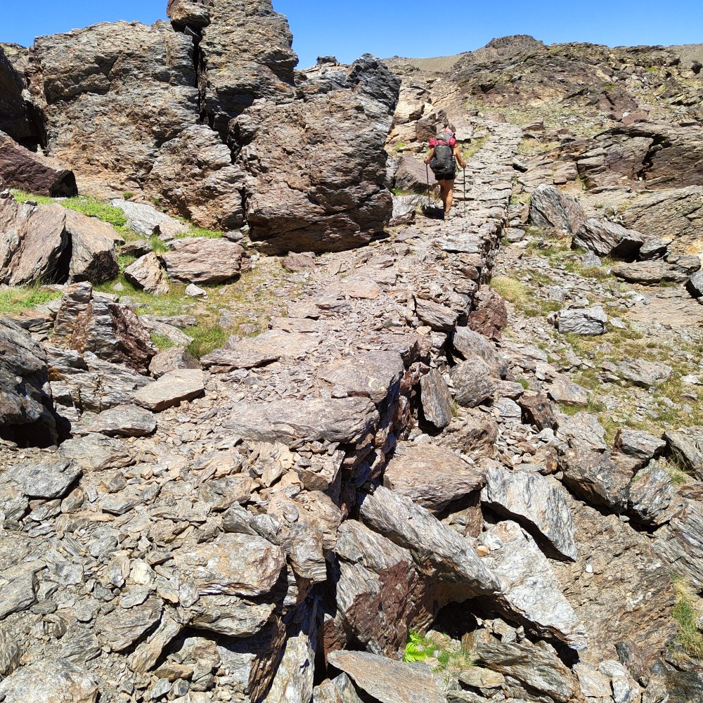 Depuis que nous sommes dans le monde minéral tout balisage a disparu, cependant le sentier étant bien tracé nous n’avons aucun tracas. Nous prenons conscience que de ne pas avoir à se soucier de notre itinéraire nous permet de mieux profiter du décor dans lequel nous évoluons.