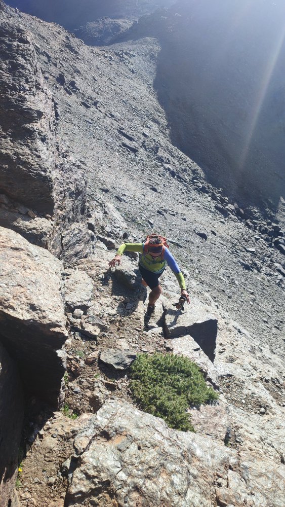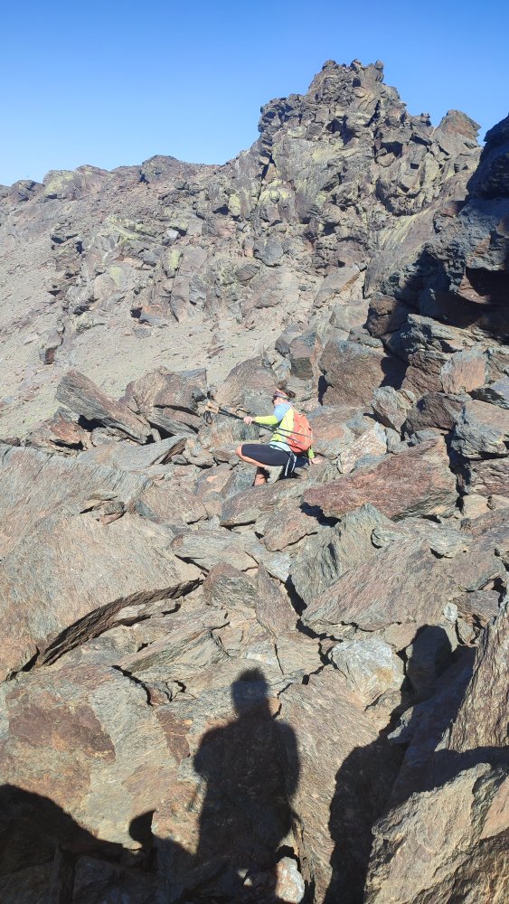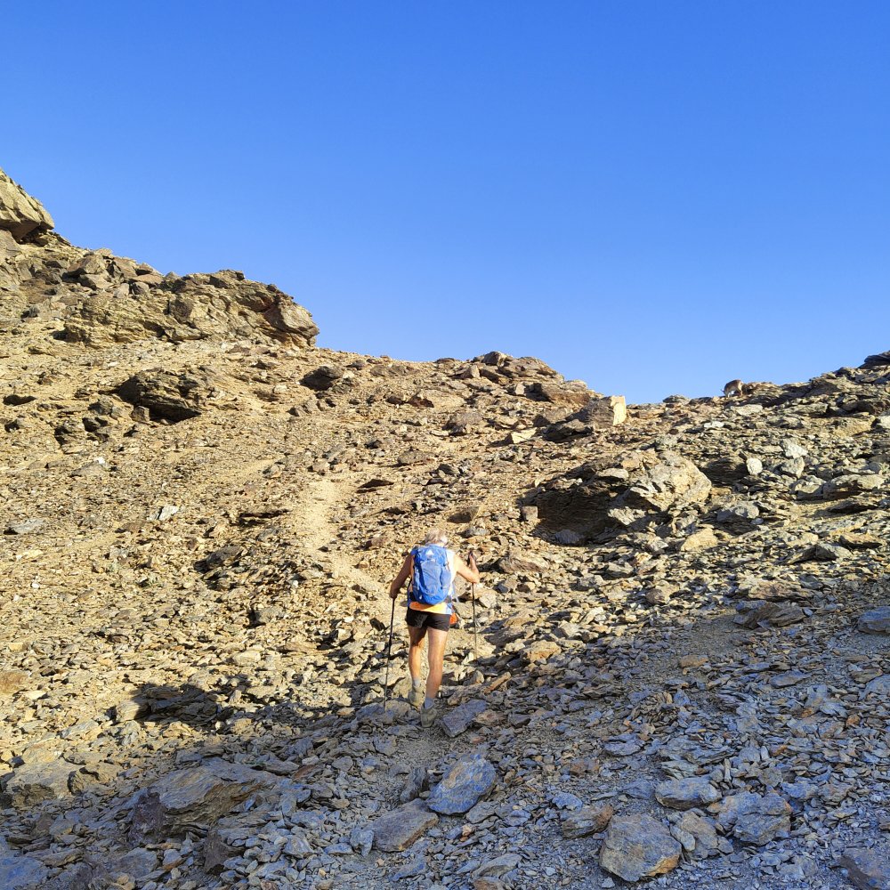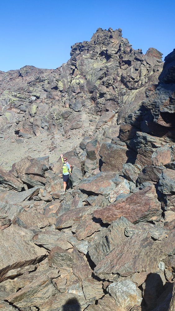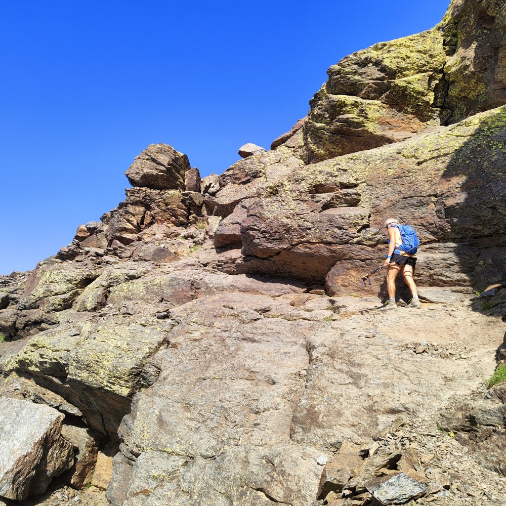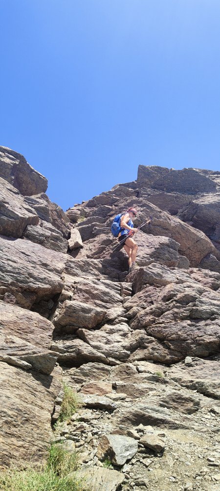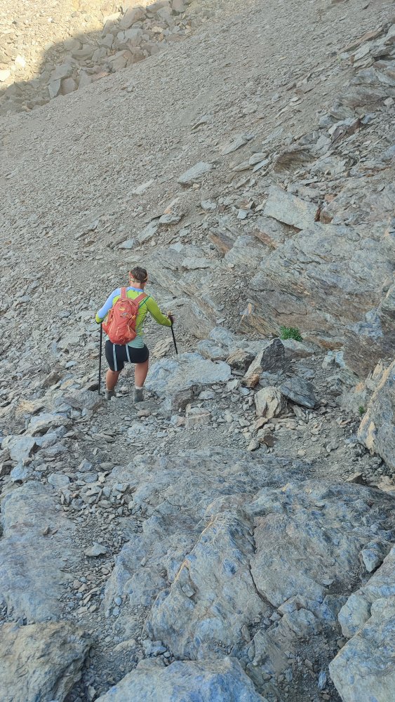 A nouveau des éboulis coupent le sentier, des cairns plus loin nous indiquent qu’il ne faut pas hésiter à utiliser les mains ou adopter des positions pas très esthétiques pour continuer. Ce que nous recherchons c’est l’efficacité.