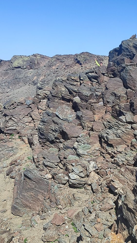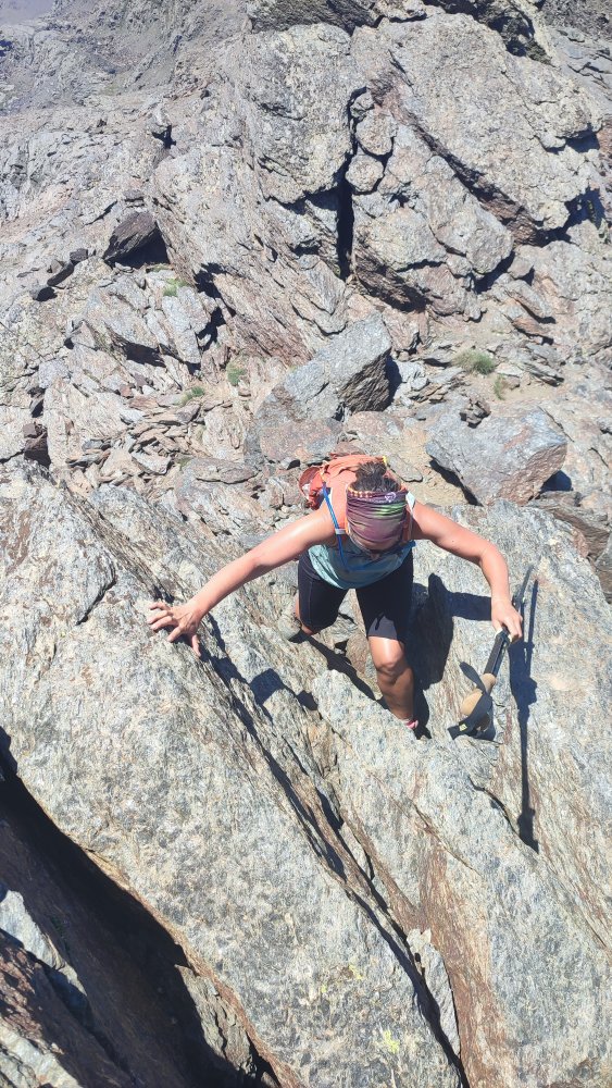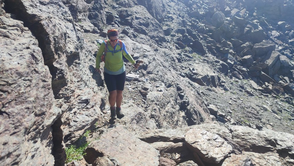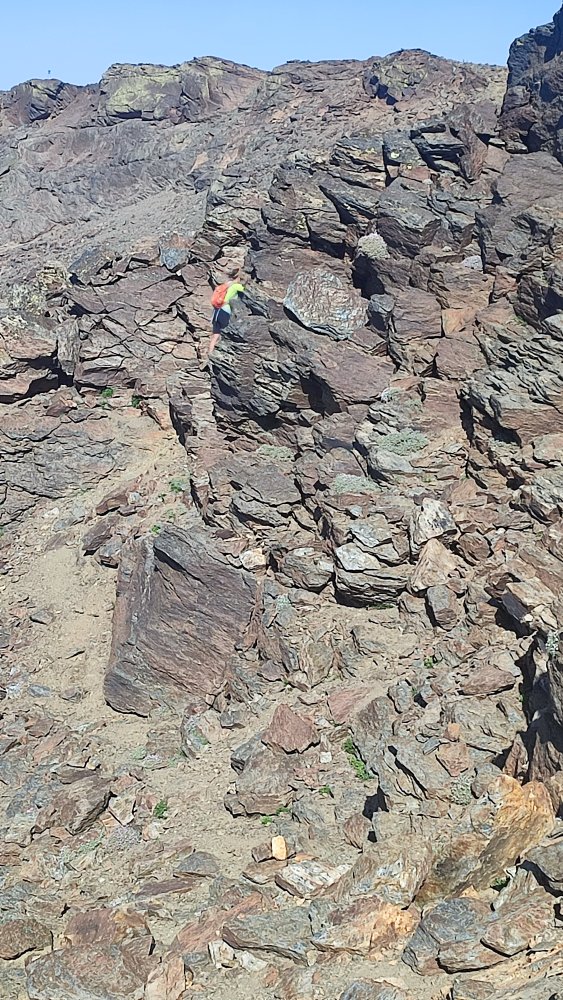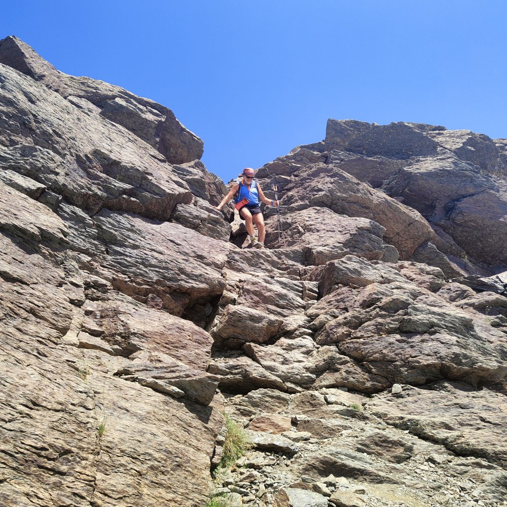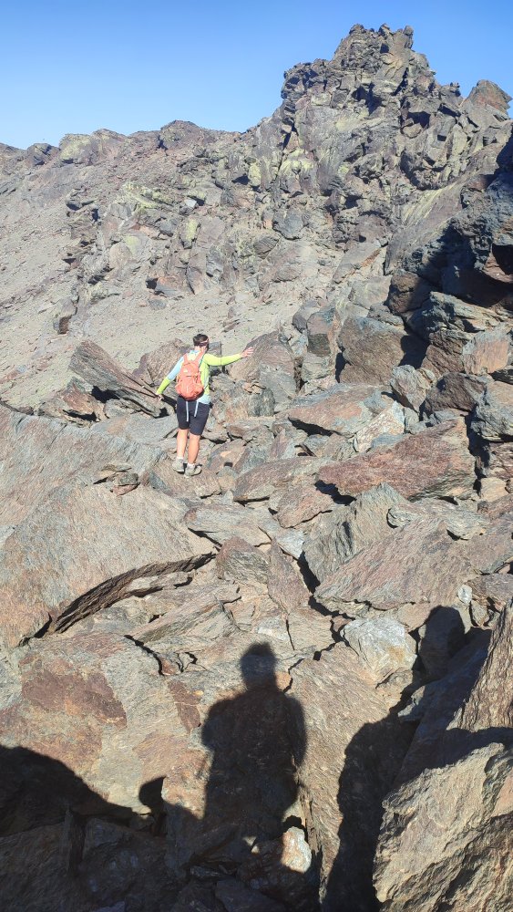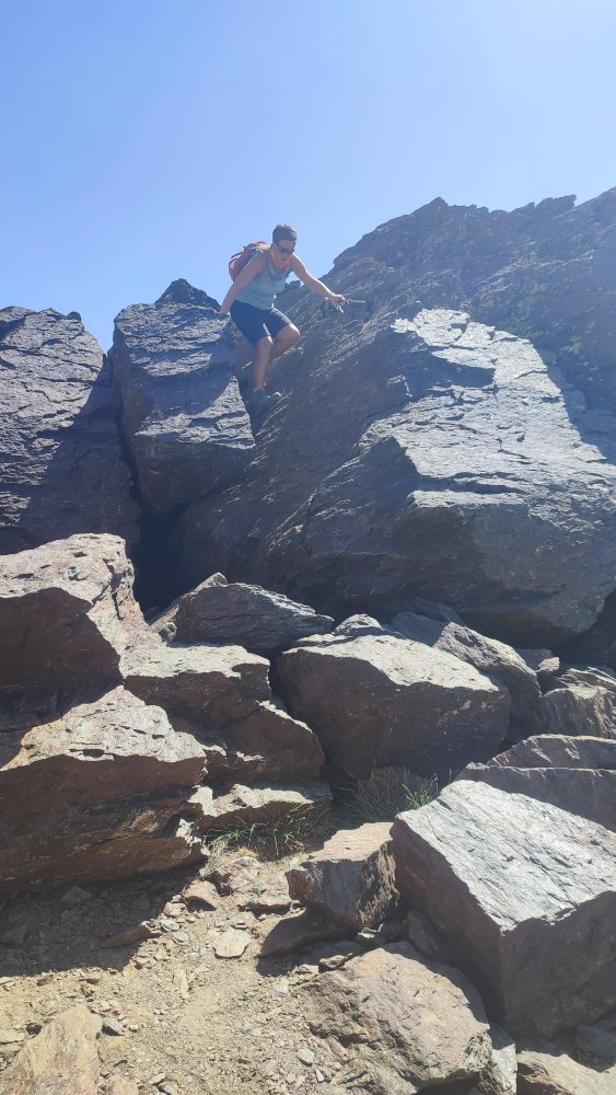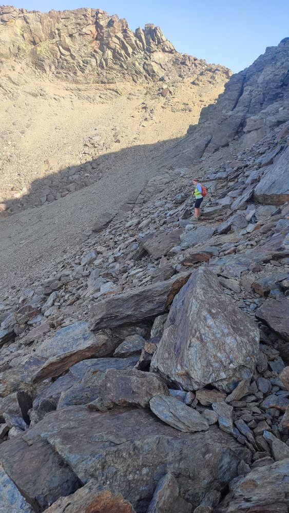 A nouveau des éboulis coupent le sentier, des cairns plus loin nous indiquent qu’il ne faut pas hésiter à utiliser les mains ou adopter des positions pas très esthétiques pour continuer. Ce que nous recherchons c’est l’efficacité.