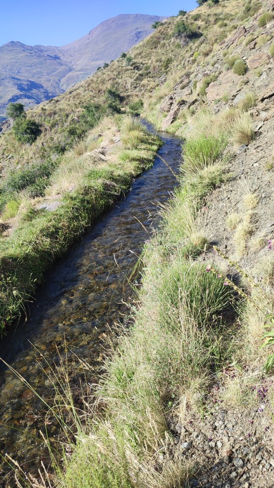Voici un » acequias « , ce sont des canaux que l’on retrouve dans ce secteur de la sierra Nevada et qui servait à irriguer les cultures. Certain sont à sec et d’autres comme celui-ci sont bien entretenus. Il a surement encore une utilité. Ces canaux cherche l’eau dans les torrents et avec la gravité peuvent avoir de légère pente montante.