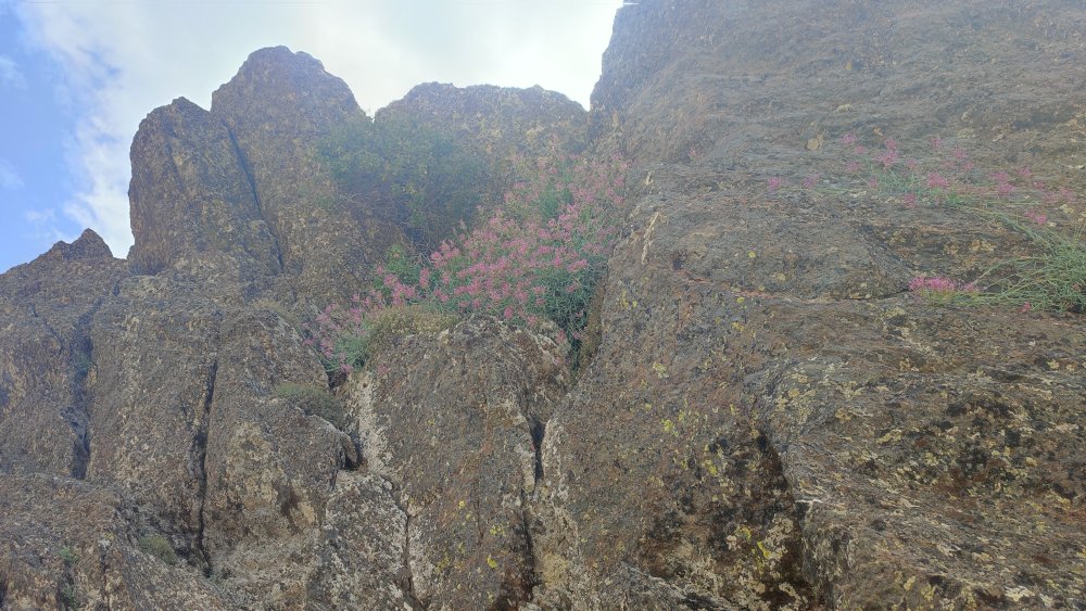 Le soleil commence déjà à bien chauffer et nous nous hydratons régulièrement, mais un break à l’ombre d’une roche va nous faire du bien. Quelle surprise en levant la tête de voir, au milieu de ce monde minéral, un bouquet de fleur trouvant la force et l’humidité pour pousser.