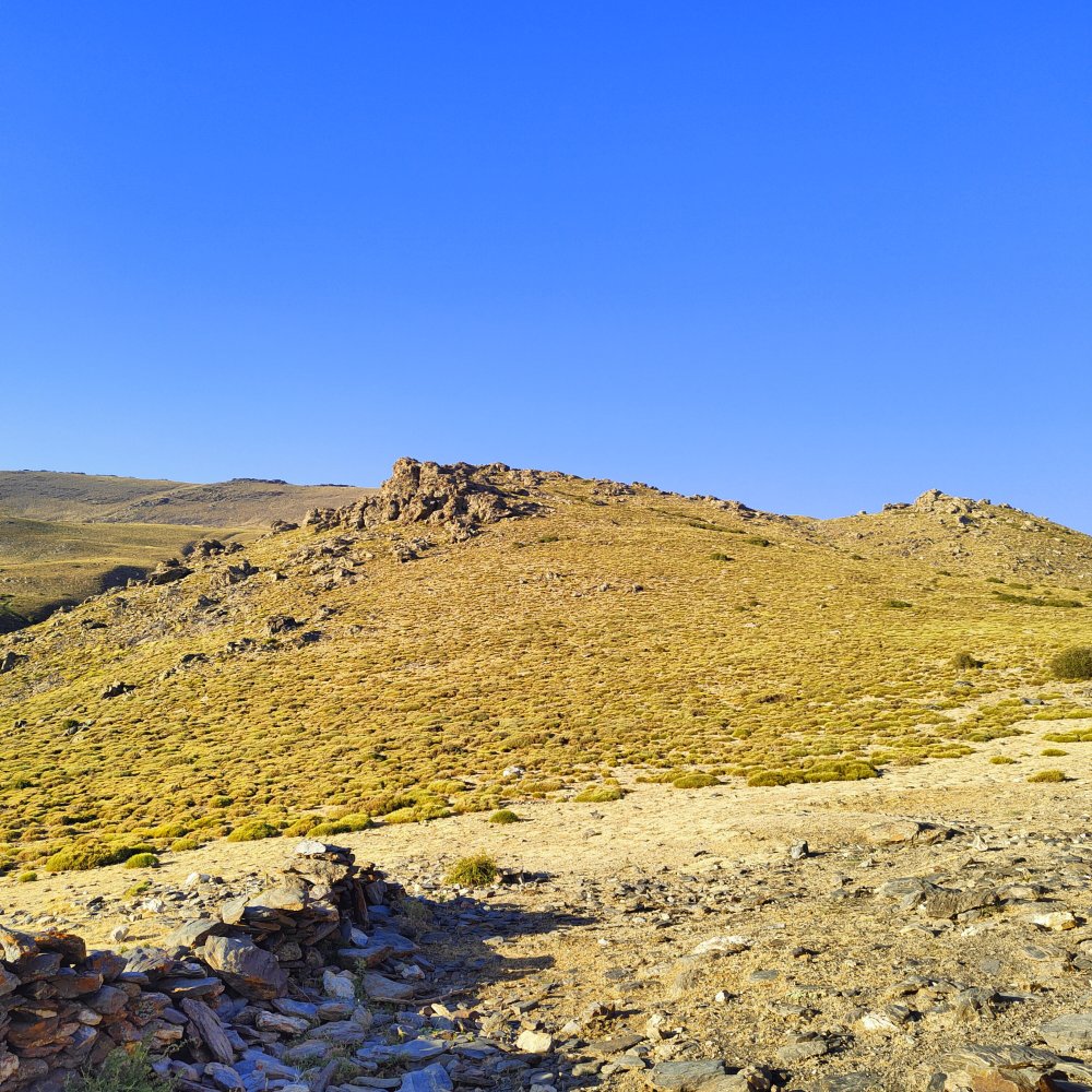 Je pousse une porte bringuebalante, je suis assailli par une chaleur étouffante. La maisonette est assez grande, il y a trois pièces. Elle a la configuration des refuges que nous avons déjà vu. Peut-être un refuge abandonné, utilisé par des bergers car vu les crottes de moutons à l’intérieur il est fréquemment occupé. Si nous avons la nécessité de nous installer, il y a même un vieux balais qui sera utile pour faire un peu de nettoyage.