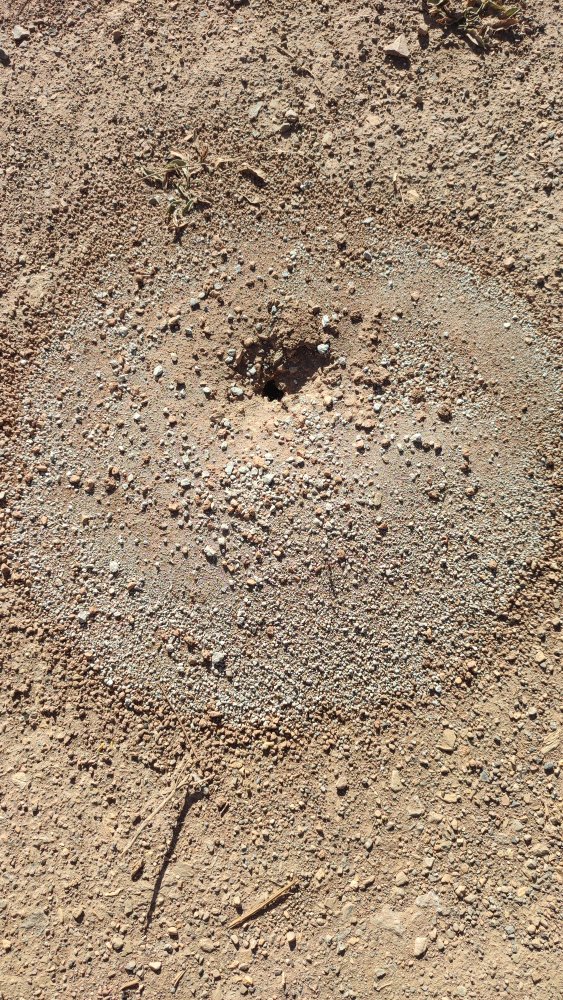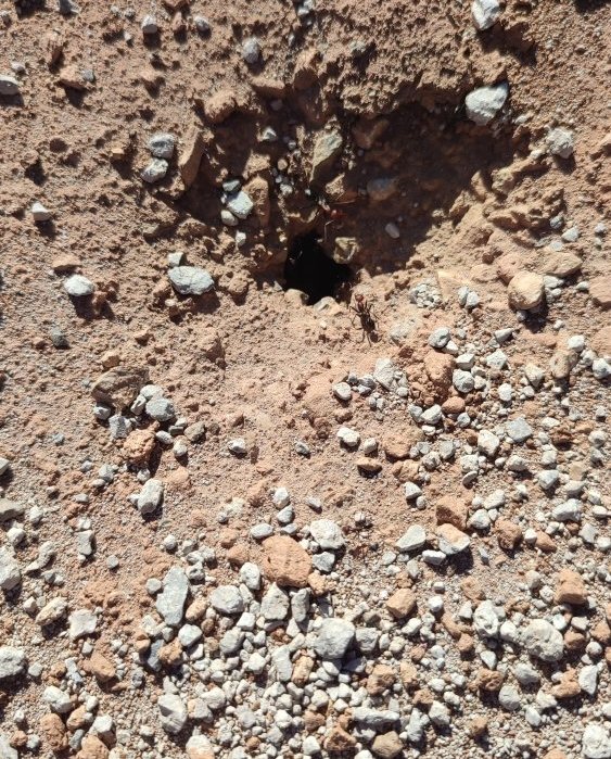 Nous observerons un rapace qui s’envole devant nous avec sa proie dans ses serres, on devine que c’est un pigeon. Et nous seront impressionnés devant la force des fourmis qui dans cette piste tassée et dure, ont été capable de pousser gravillon par gravillon afin de se faire une sortie.