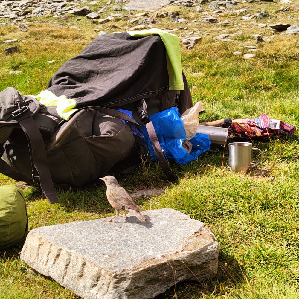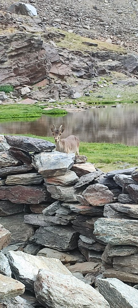Nous arrivons en ce lieu idyllique, situé à 2950 mètres d’altitude, en début d’après midi. Nous mangeons, effectuons une sieste et profitons pleinement d’une magie orchestrée par le lac, les falaises, les cabras, les fleurs et le silence.