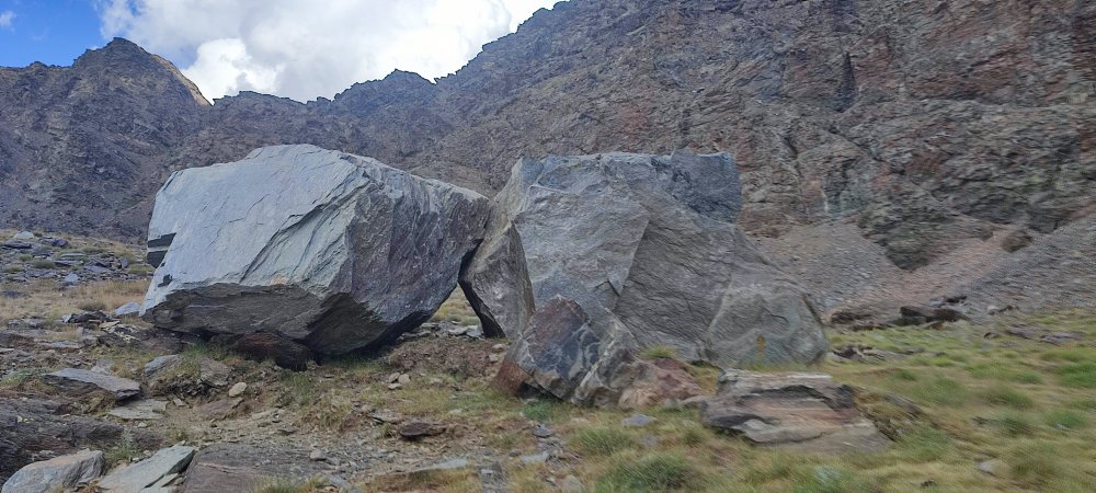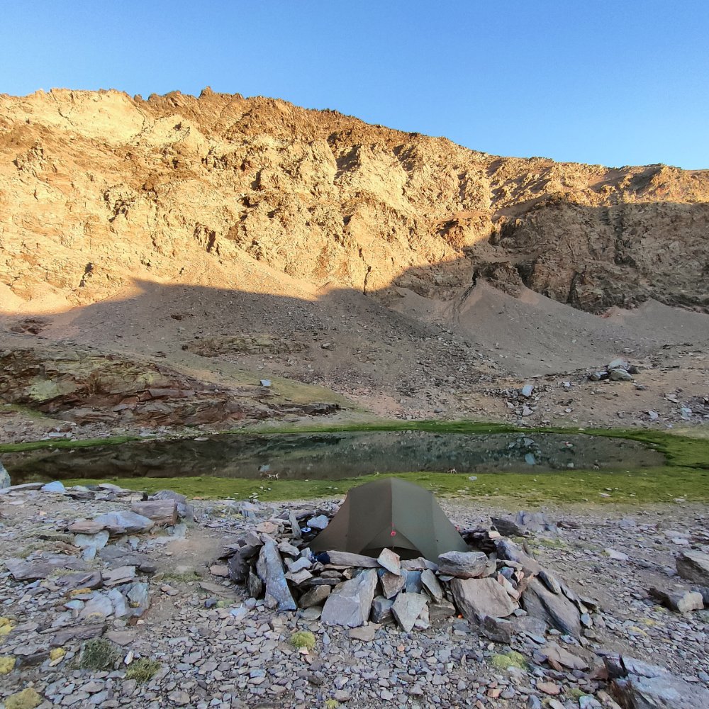 Une sardine tenant l’une des cordelettes qui aubane la tente est arrachée du sol. Nous nous relevons, mais le sol est trop caillouteux pour que les piquets tiennent correctement. Nous trouvons une solution en les bloquants avec de grosses pierres plates. Le vent va prendre de la force tout au long de la nuit et c’est une véritable tourmente que nous allons connaitre avec des bourrasques qui bousculent et ballotent la tente tel une coquille de noix dans l’océan en tempête.