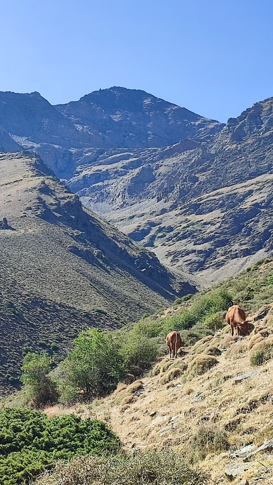 Ça grimpe tout droit et les chaussures dérapent. Ouf ! La crête, la vision du Mulhacen imposant nous éblouit par sa majestuosité et nous ne tiendrons aucune rigueur aux vaches.