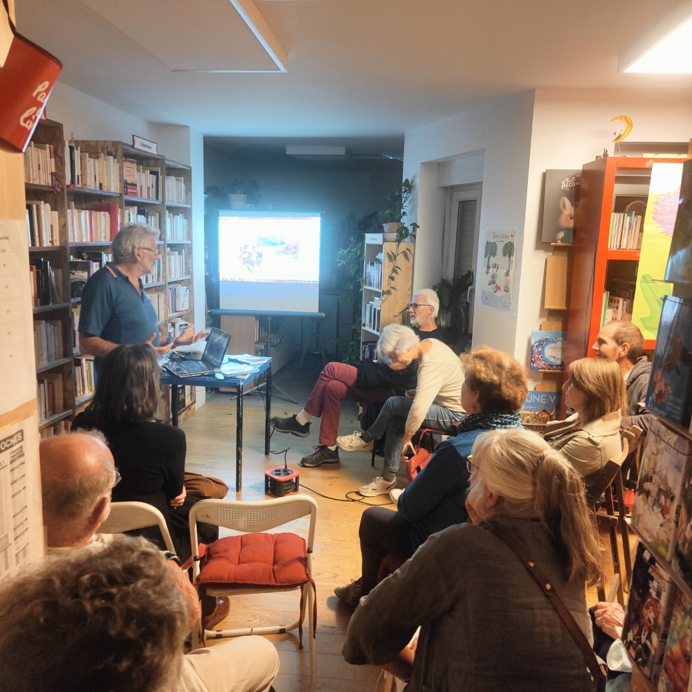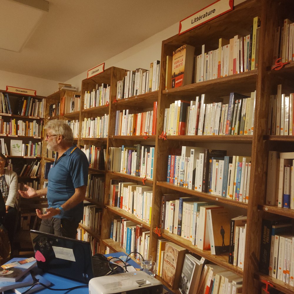 En ce qui nous concerne, la librairie qui n’est pas bien grande, affichait presque complet pour la conférence et la vingtaine de chaises préparées n’a pas suffit pour accueillir tout le monde.