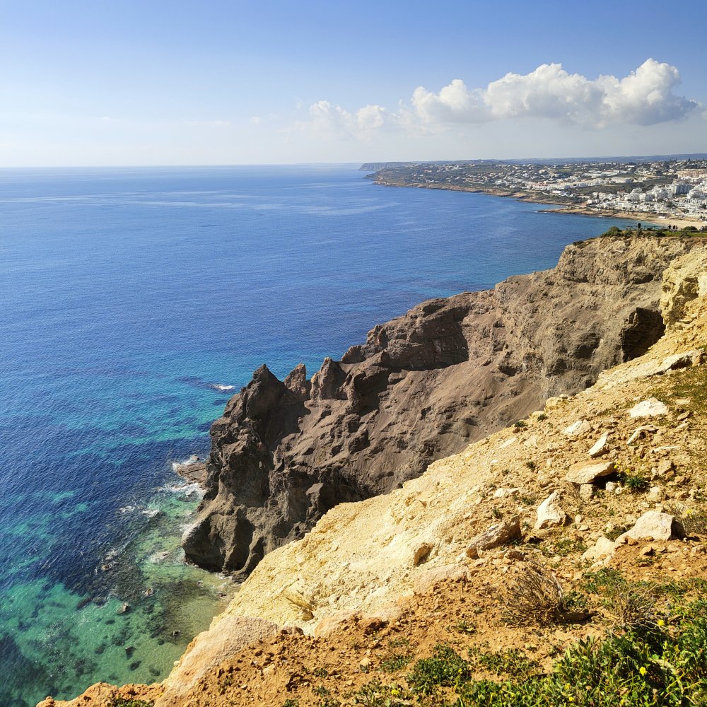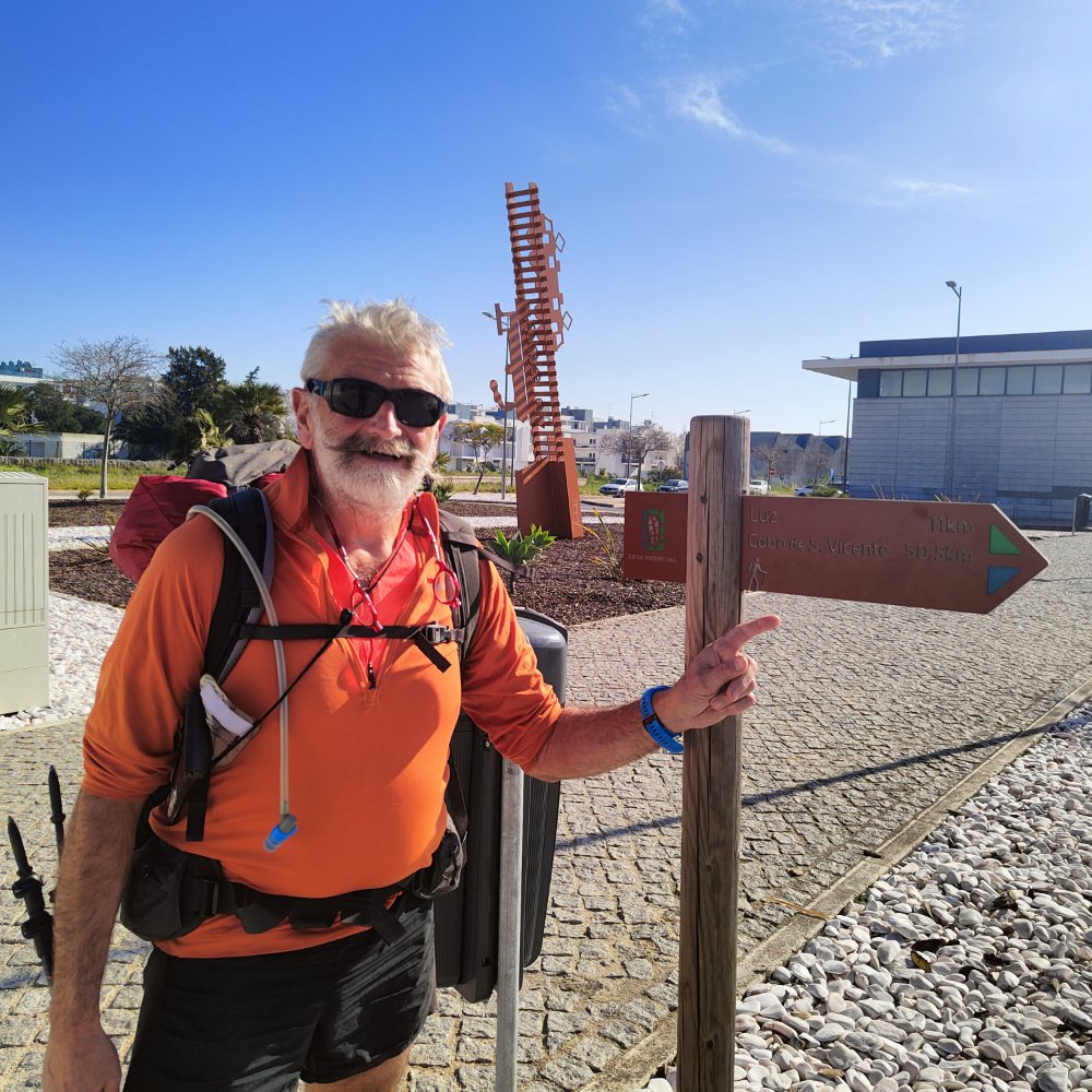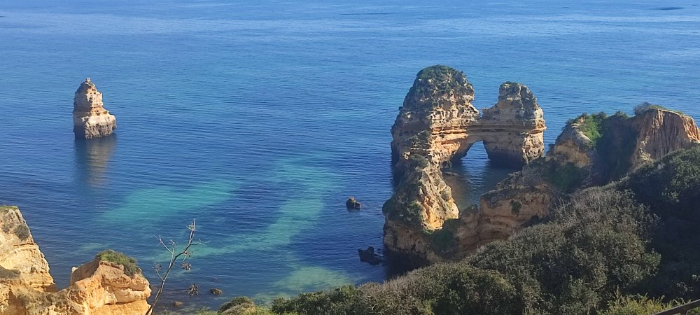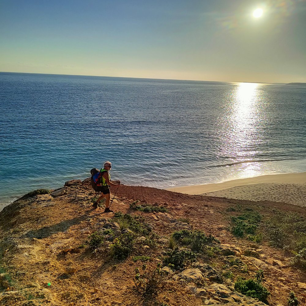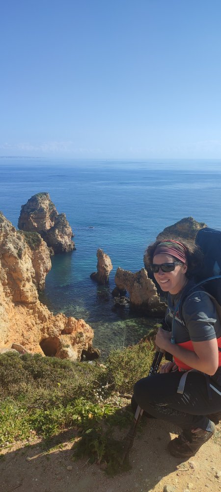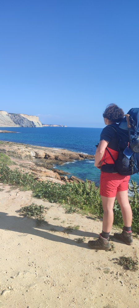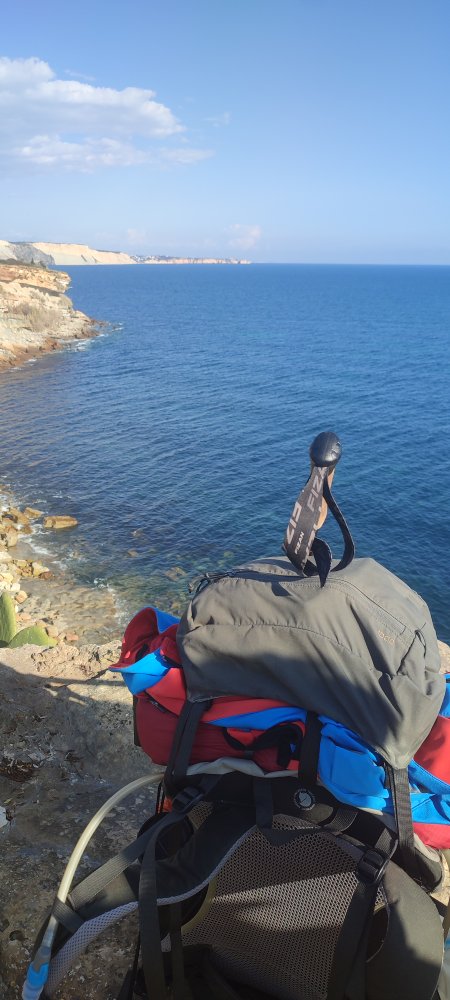 Ce spectacle nous permet de passer la pontade da Piedade. Puis de gravir les immenses falaises qui séparent Lagos de Luz. C’est là que nous cassons la croûte, c’est alors que nous constatons que ma poche à eau fuit ou bien elle a énormément condensé dans la nuit. Enfin mon duvet est trempé et heureusement que je mets toujours mes vêtements dans des sacs plastiques.