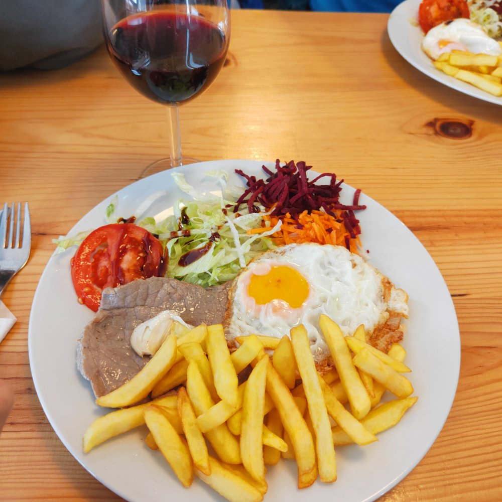 Nous n’hésitons pas et faisons escale dans le premier bar-restaurant que nous rencontrons. Avant toute chose une tisane pour nous réchauffer. Puis nous passons aux choses sérieuses et commandons une bitoque de vaca.