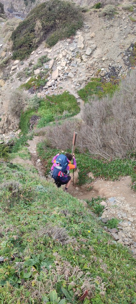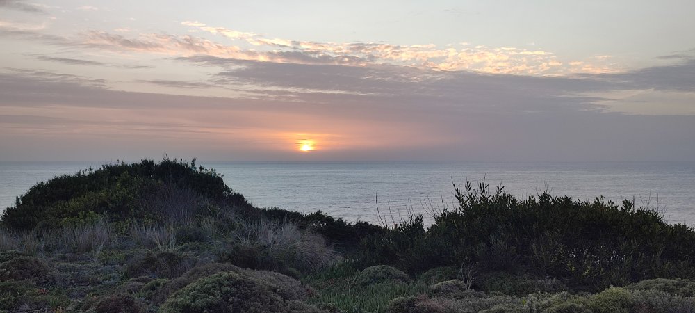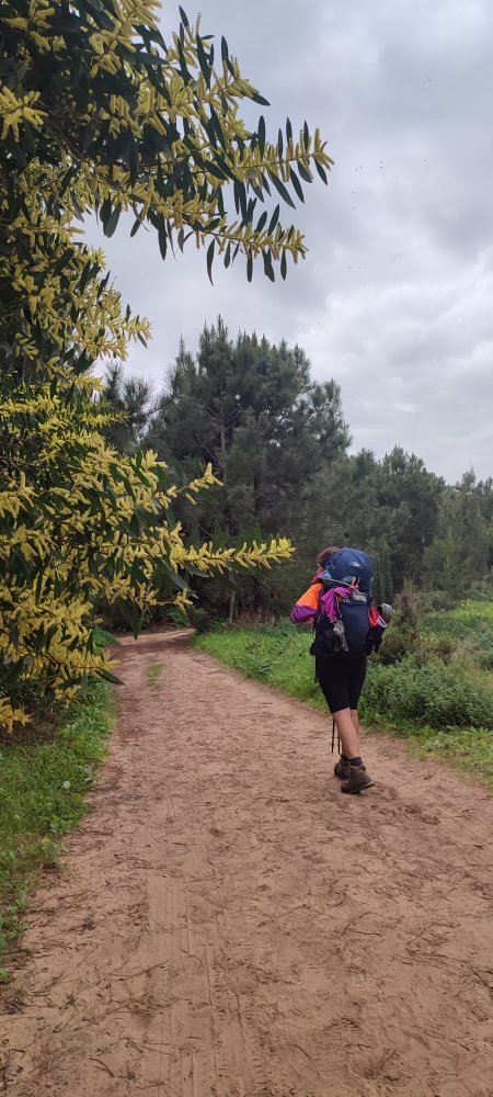 Arrivés à l’estuaire, il nous faut gravir une côte au sévère pourcentage pour atteindre le haut des falaises. Un magnifique chemin bordé de mimosa nous attend pour rejoindre l’océan.