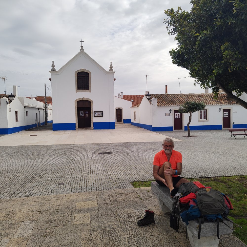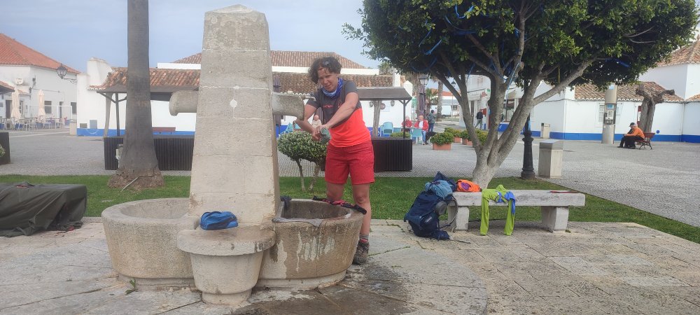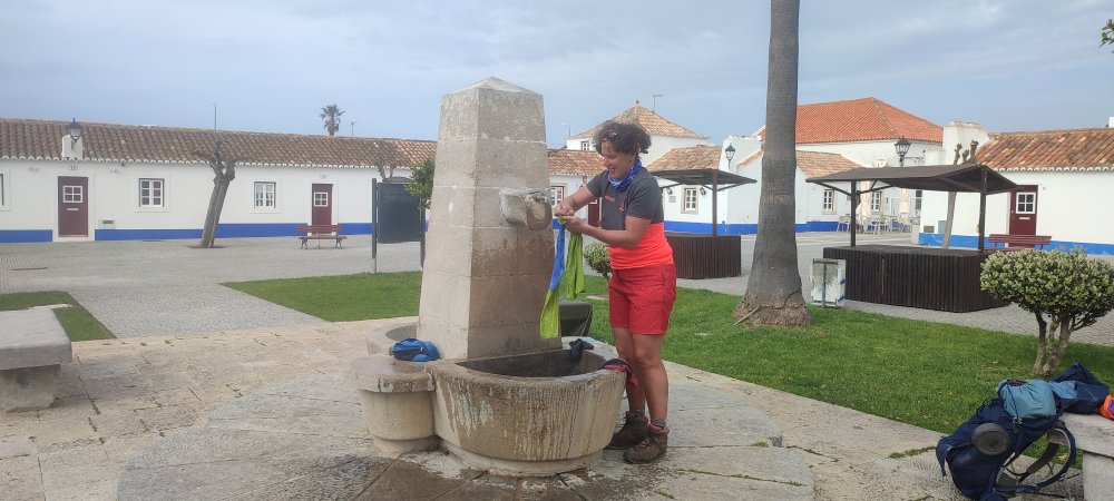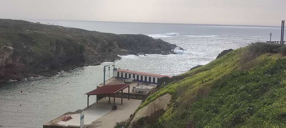 Nous voyons le bourg de Porto Covo qui doit être le milieu de notre étape, mais avec ce sable nous avons l’impression de ne pas avancer et alors que le sentier nous fait passer sur une plage voilà un petit estuaire, point de pont seul solution le saut en longueur !