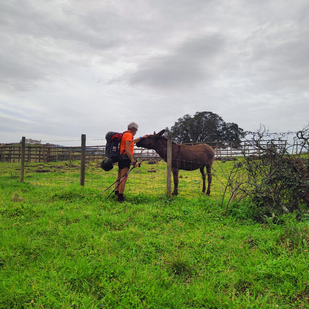 Un peu plus loin alors que nous arrivons au sommet d’un raidillon, un ane braie pour nous accueillir. Il est tout seul dans son pré et doit bien s’ennuyer. Alors il réclame un peu d’attention. Difficile de ne pas aller le gratouiller un peu.
