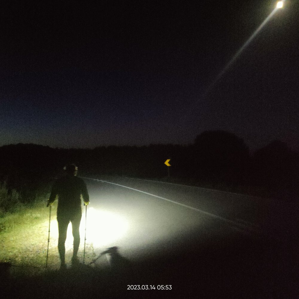 J’aborde la partie plate et quel bonheur quand je passe la première lumière de l’éclairage public, j’approche mais il me reste encore trois kilomètres. Ce lampadaire était isolé et maintenant il fait nuit. Une ombre apparaît, c’est la plus belle qui puisse arriver à ce moment. Laetitia, elle n’a pas mes lunettes, mais a pensé à la frontale. Parti ce matin avec la frontale et je termine à la frontale.
