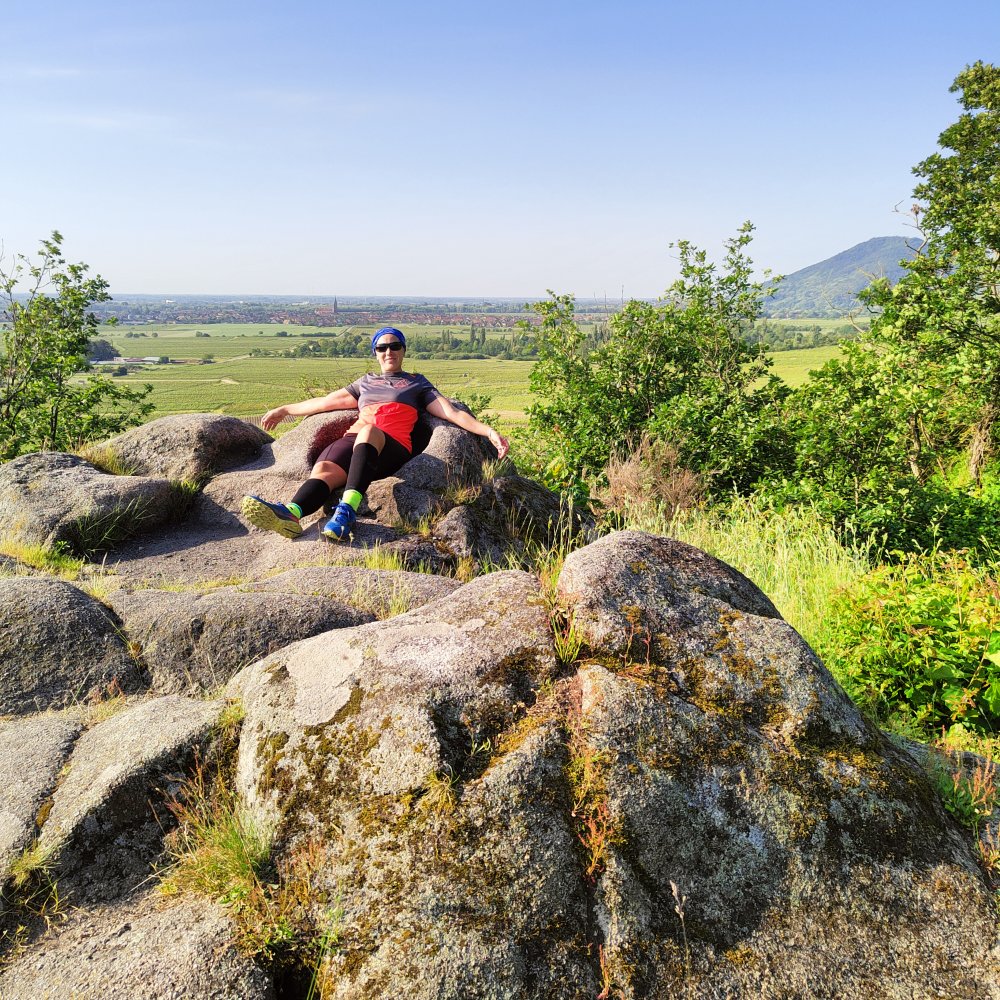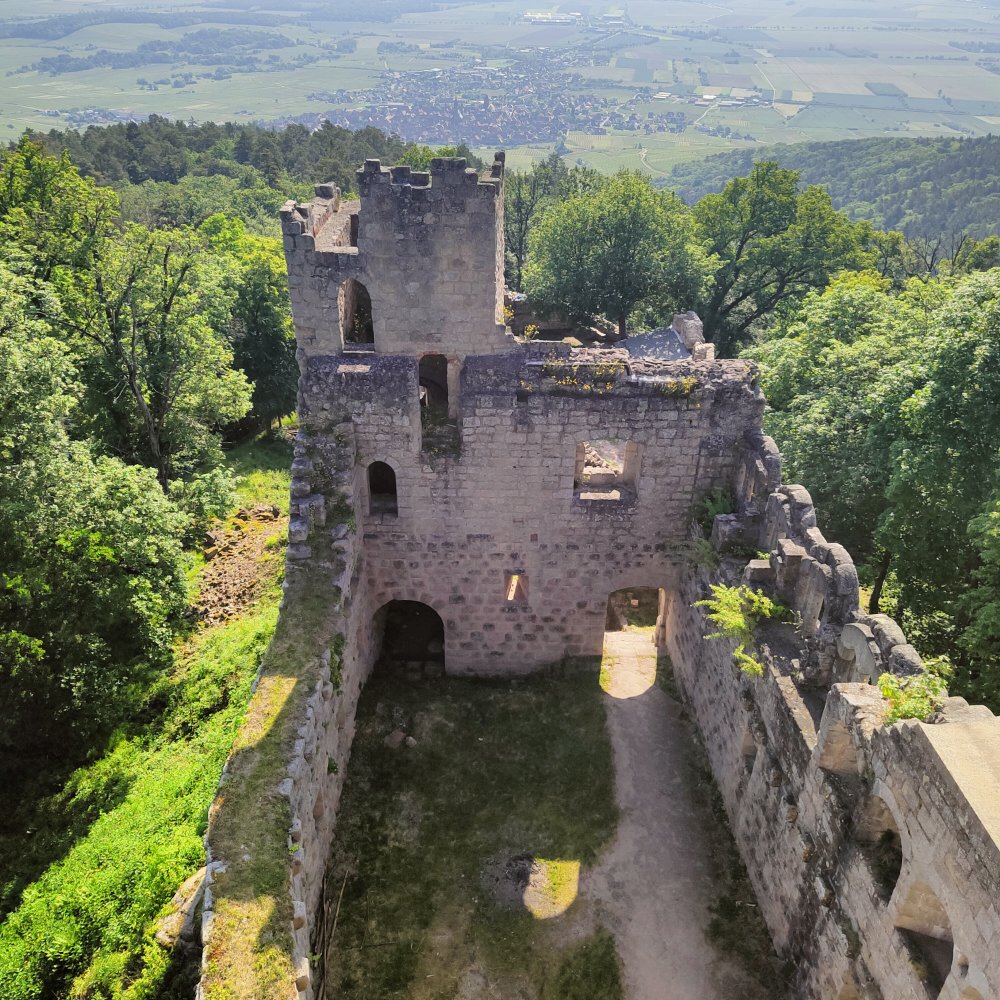 En pleine forme, nous filons vers l’un de ceux-ci camouflés au milieu des acacias en fleurs qui embaument l’atmosphère et ravis les polinisateurs : le château du Bernstein