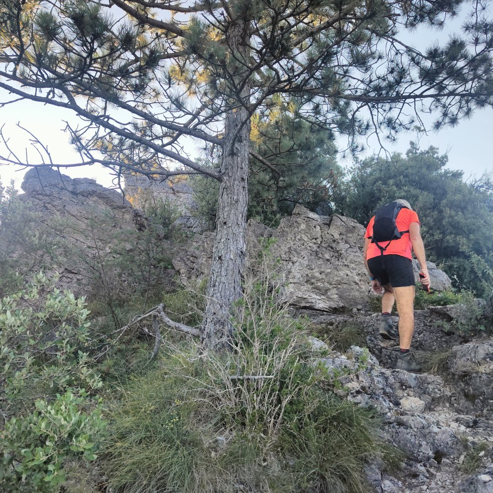 La pente se redresse, les troncs des chênes qui doivent avoir de la peine à pousser en ce lieux venteux et pierreux nous aide à nous hisser. Nous franchissons plusieurs passages rocheux où nous avons besoin de nos mains.