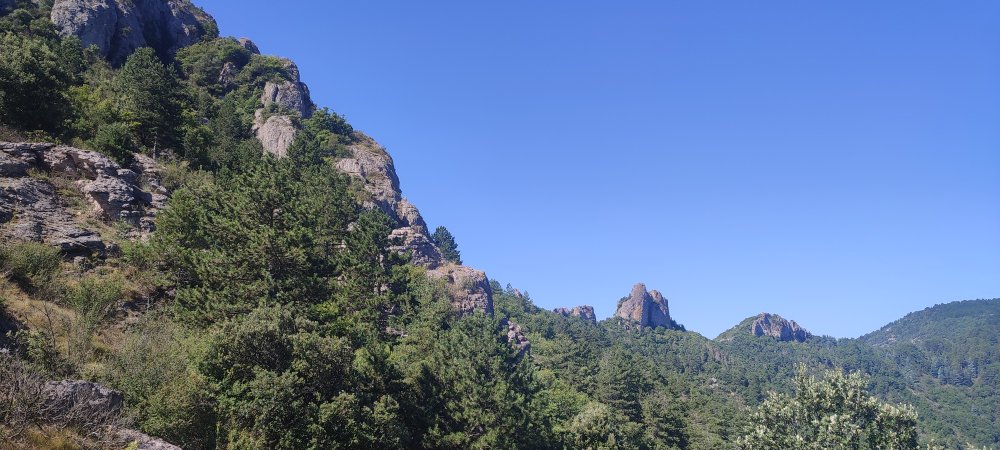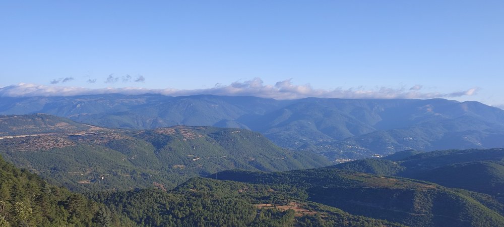 Nous marchons pendant deux kilomètres dans une forêt de pins où nous manquons d’air, la chaleur est pesante. Nous passons quelques points de vue où chaque fois nous admirons le paysage et les montagnes aux courbes douces. Le sentier est de plus en plus envahit par la ronce. Nous arrivons au lieu où un panneau nous indique rocher de la Tude 862 mètres mais point de roche remarquable. Un rocher est bien présent envahit par la végétation lierre et ronce rien qui ne mérite ce détour. Il ne reste plus qu’à redescendre sur un sentier très étroit et enfin nous retrouvons après 15 kilomètres notre véhicule. Il est un peu plus de midi et l’estomac nous rappelle que le casse-croûte pris en milieu de matinée est bien loin.