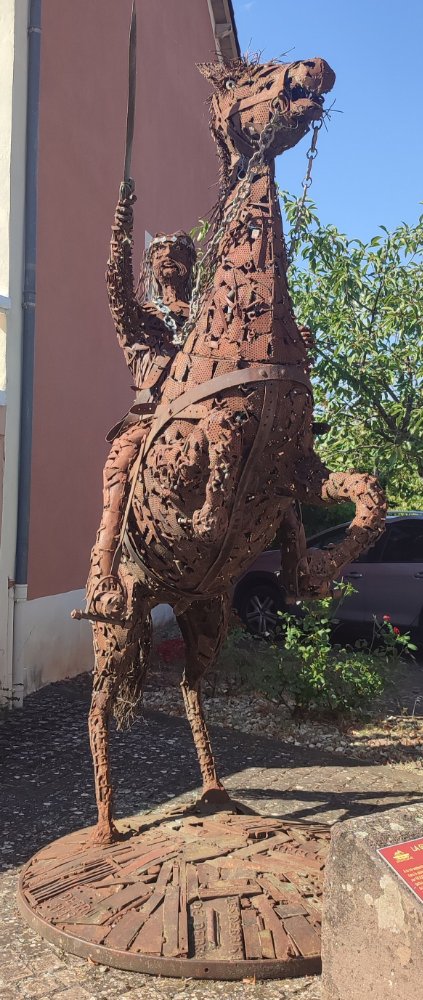 Voici pour le moins une sculpture originale qui évoque la guerre de Cent Ans. L’an 1369 dans la plaine de Montlaur l’armée anglaise se bat contre les troupes du roi de France. Les Anglais sont mis en déroute. Ouf notre honneur est sauf ! (Ndr)