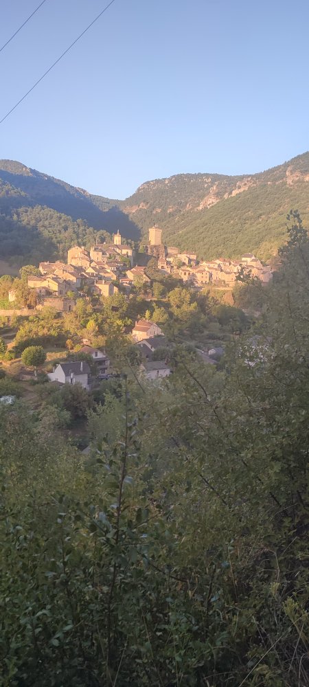 Nous quittons le village de Rozier et nous avons une vue avec lever de soleil sur le bourg de Peyreleau, c’est extraordinaire !