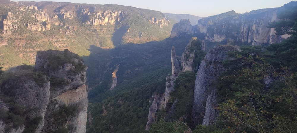 Le panorama est remarquable, nous dominons la confluence du Tarn et de la Jonte, nous sommes comblés d’être venus jusqu’ici. Maintenant, il ne reste plus qu’à redescendre, Laetitia évite de trop regarder le vide, je ne dirais pas que je saute comme un cabri, mais je suis à l’aise, à mon grand étonnement.