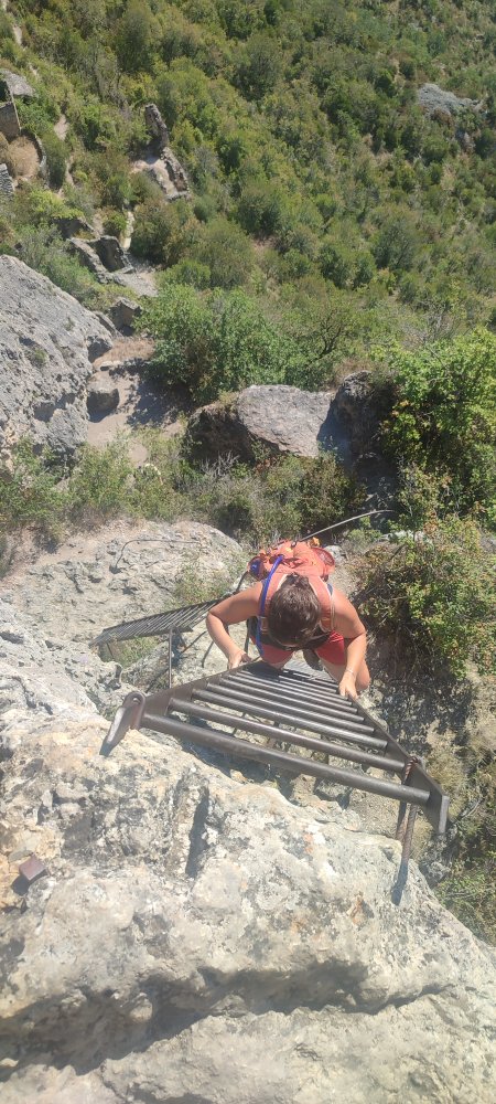 Tout va bien et nous voici au pied de la deuxième échelle qui doit être un peu plus longue, cinq mètres environ, avec le vide dans le dos. Effectivement quand j’arrive dans le milieu de l’échelle un ancrage est sorti du ciment, mais les attaches du haut sont résistantes. Laetitia grimpe avec une grande concentration. À l’arrivée de l’échelle se trouve une plate-forme où il n’y a pas la place pour se retourner, la dernière échelle d’une longueur identique aux autres, nous attend pour nous permettre de poser le pied sur la sommité à 587 mètres au-dessus du niveau de la mer et 200 mètres au-dessus de Rozier.