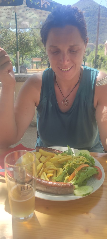 Très satisfaits de notre randonnée de 13 kilomètres parcourus dans la matinée, nous sommes allés dans une guinguette manger un repas exceptionnel : Saucisse, frites. C’est surtout des frites que nous avions très envie et nous sommes tombés sur des frites maison, nous nous sommes régalés.