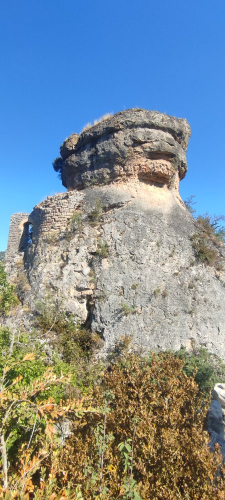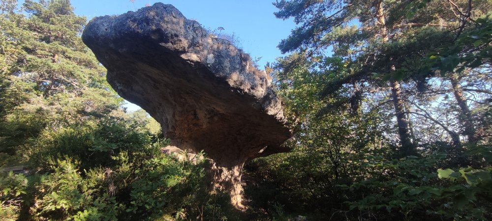 Cet environnement est fantastique et nous ne nous lassons point de ces roches dominant les gorges avec majesté. Nous voici près d’une roche dont la base fut bien travaillée par l’érosion de ce fait elle prend la forme d’un beau champignon dont le chapeau est bien ouvert.
