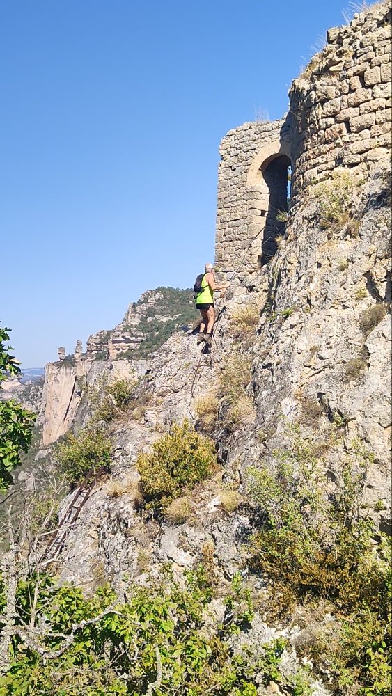 Face à nous une roche champignon que l’on atteint en passant dans un goulet, puis une vire pour rejoindre une plate forme où se trouve une nouvelle échelle afin de rallier la sommité du champignon.