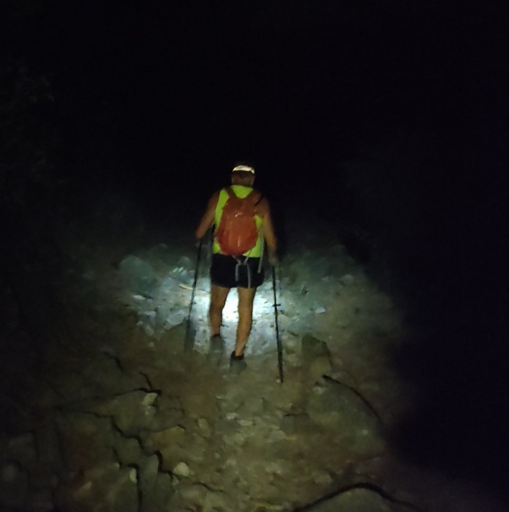 Nous suivons la route goudronnée sur deux kilomètres, pour une mise en jambe, ce n’est pas mal. Puis nous abordons un sentier escarpé dans les roches, avec la nuit, nous redoublons de vigilance.