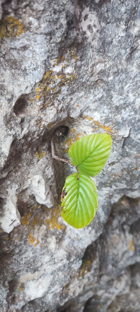 La graine d’un nerprun des alpes s’infiltrant dans une anfractuosité est arrivée à donner naissance à cette pousse. Jusqu’où pourra-t-il grandir ?