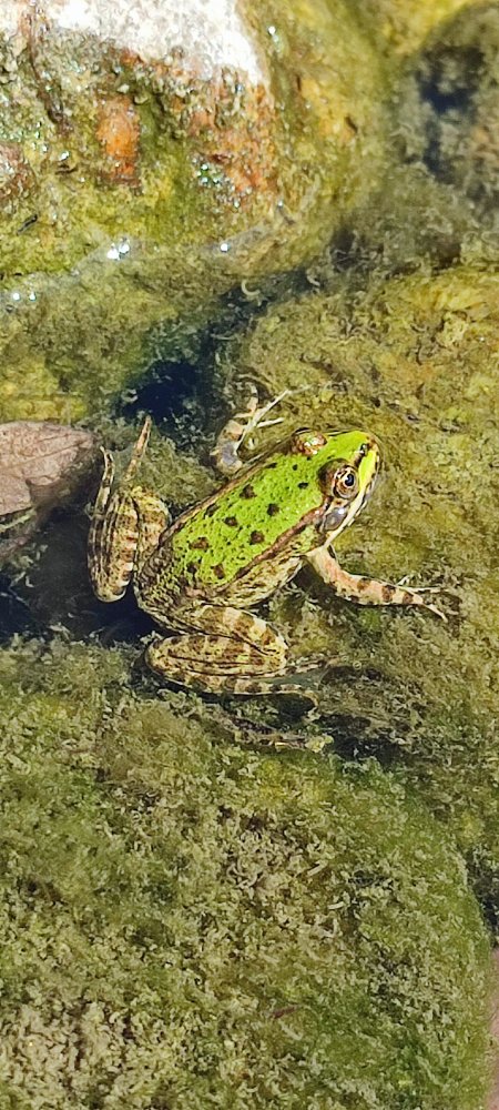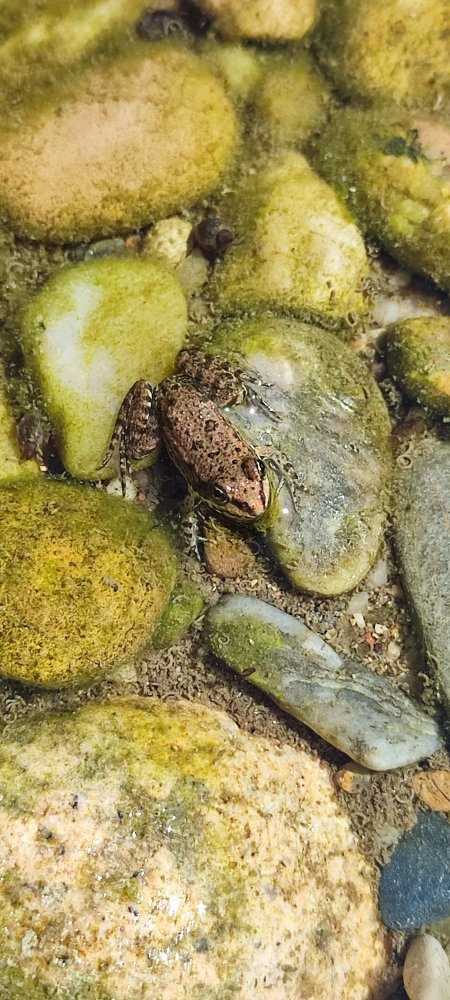 Tu crois peut-être, lecteur qui m’accompagne, que nous allons piquer une tête? Détrompe-toi, car à cet endroit l’eau est peu profonde. Par contre, ce sont les petites grenouilles qui à notre arrivée sans hésiter plongent puis interrompent leurs nages ; chut, elles veulent se faire admirer, il ne faut pas les apeurer.