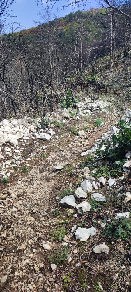 Enfin, nous repartons et à mi-pente, nous traversons une zone qui fut ravagée par le feu, c’est spectaculaire surtout avec la roche blanche qui ressort avec force.