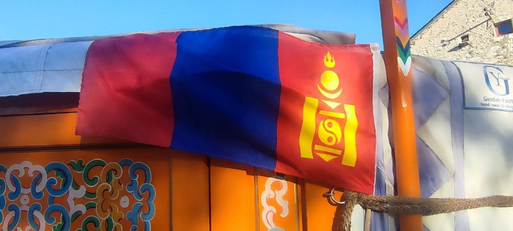 Petite précision : hier en marchant dans cette steppe caussenarde, j’ai eu l’idée de l’apparition dans mon texte de Orda. Ce matin quand nous sommes arrivés dans le premier hameau il y avait une yourte utilisée par l’association TAKH avec le drapeau Mongol.