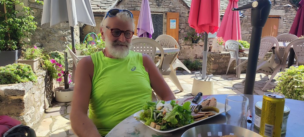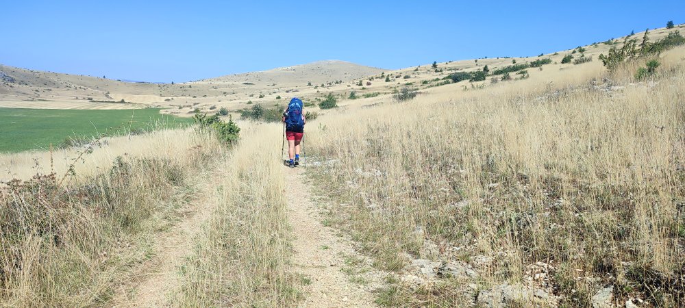 Nous effectuons notre ravitaillement en eau. Ici l’eau est rare, le causse étant brûlé par le soleil et asséché par le vent.