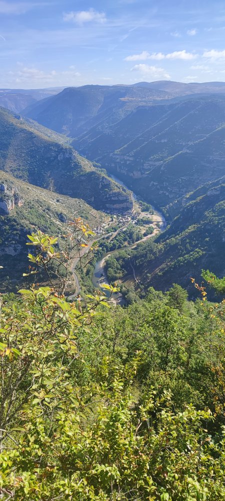 Nous allons descendre jusqu’à ce village qui paraît miniature, longer sur deux ou trois kilomètres le Tarn pour remonter.