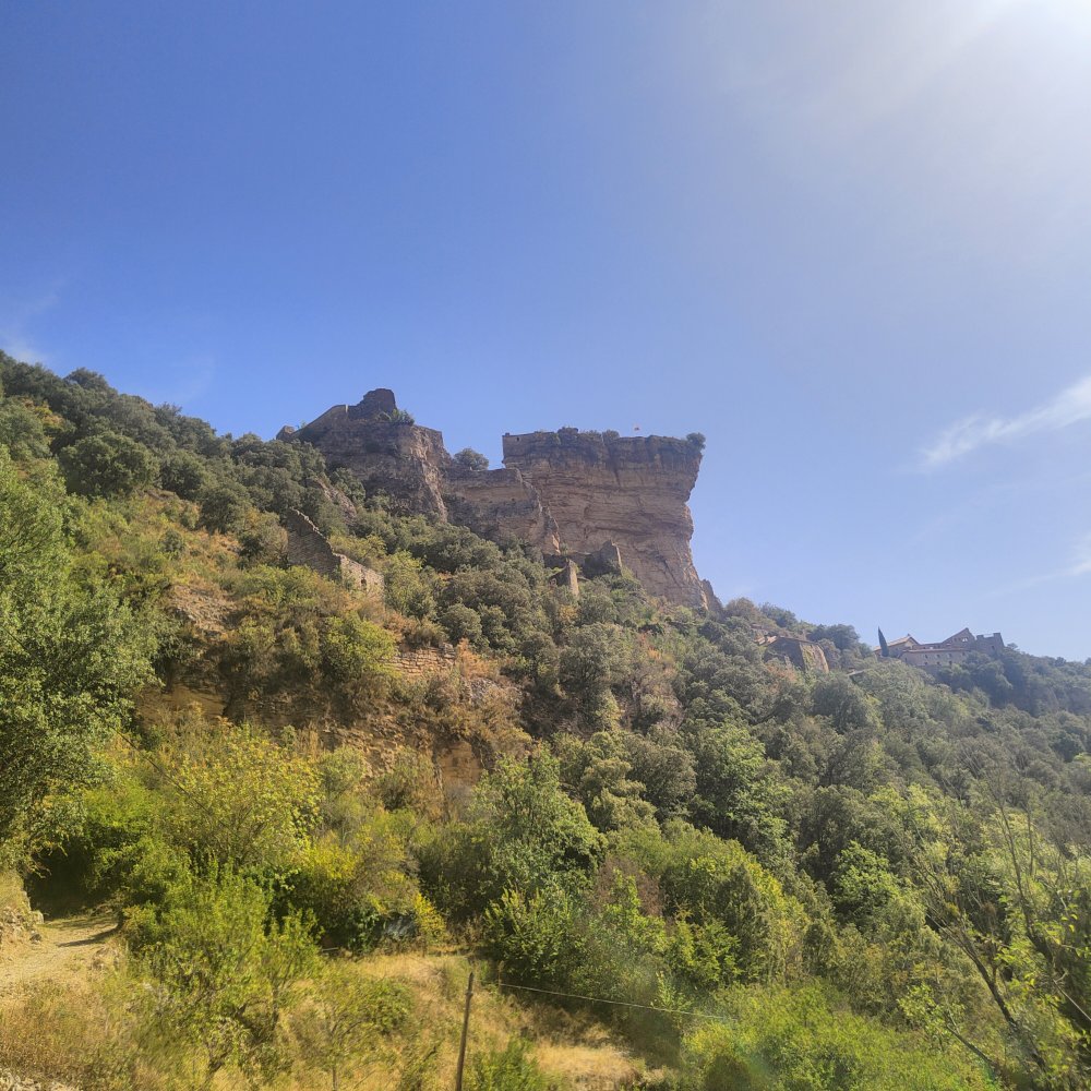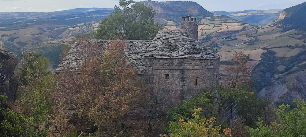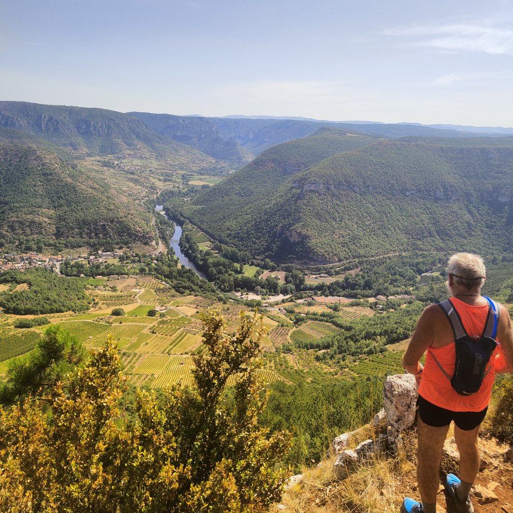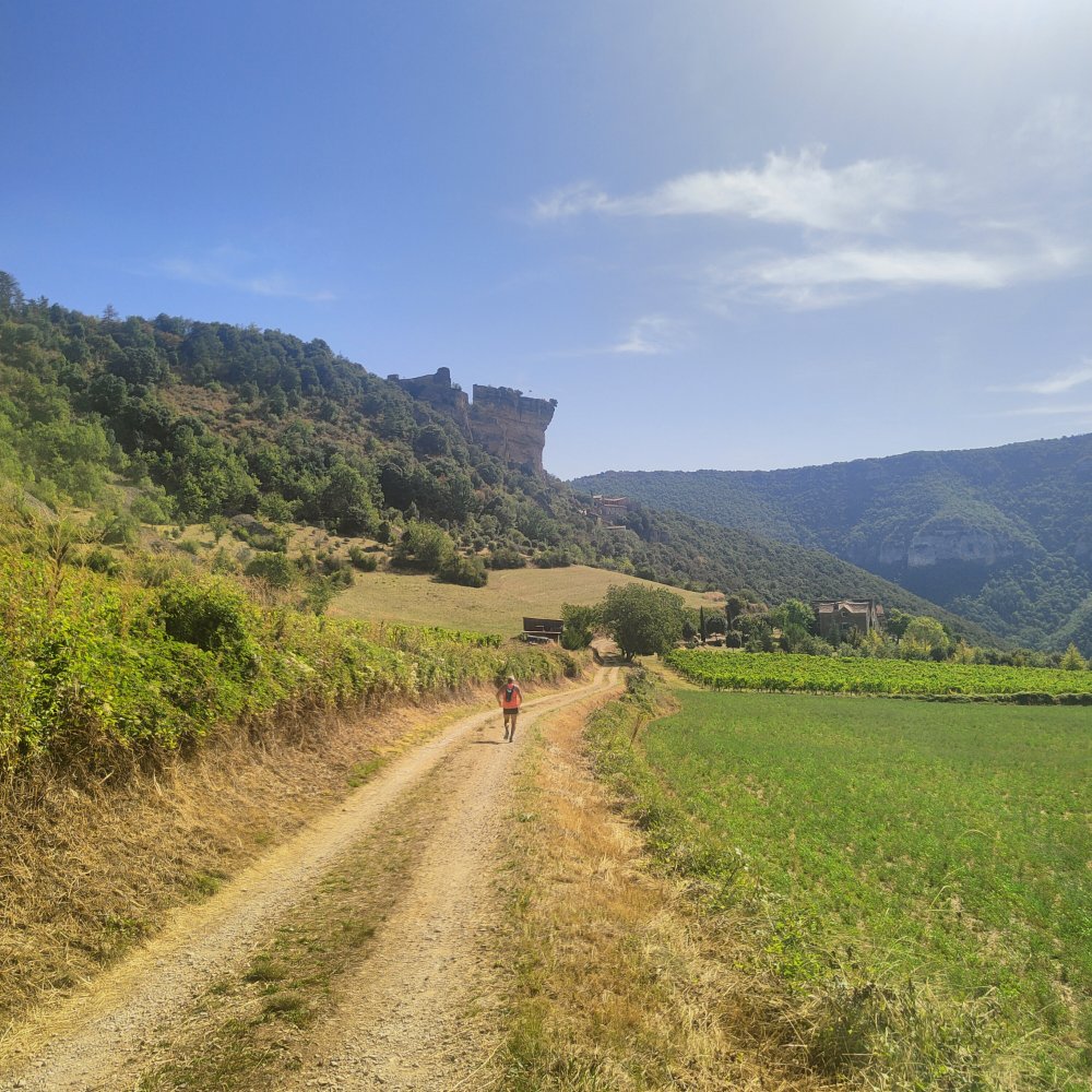 Le sentier se calme et se poursuit sur une section plate. Nous dominons le château de Peyrelade.