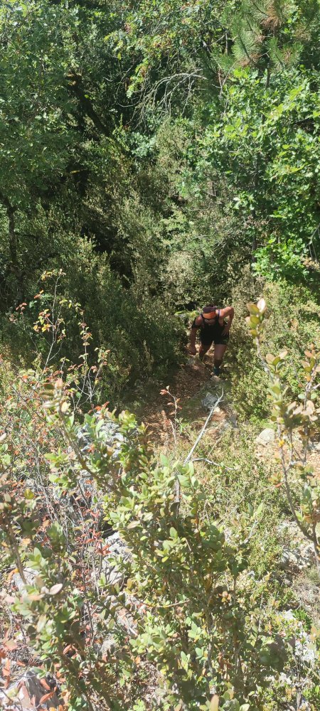 Le balisage est clair, à présent il faut tourner à gauche sur un sentier très étroit qui monte bien et se faufile dans une forêt de pins.
