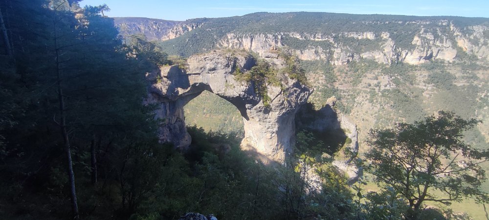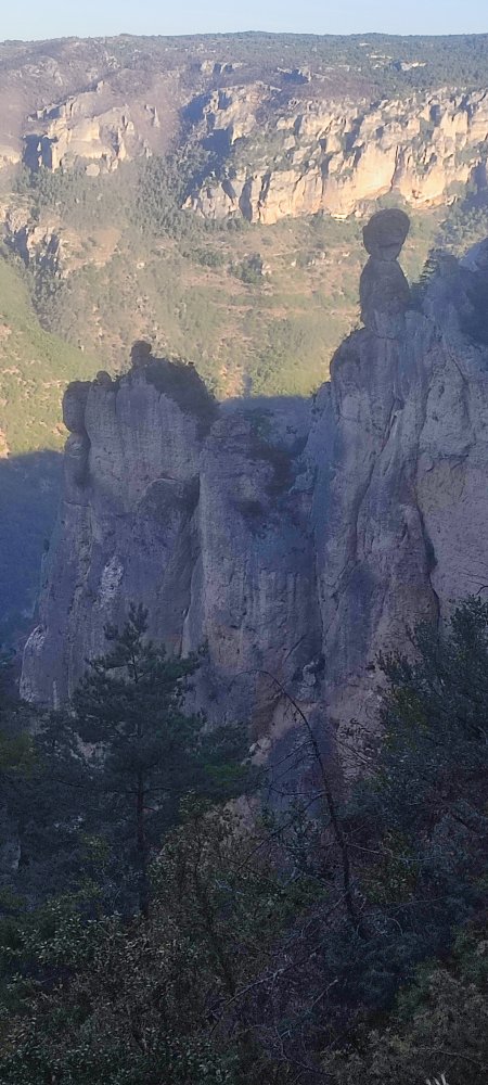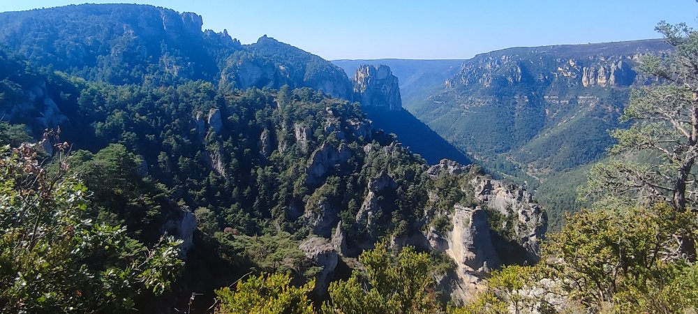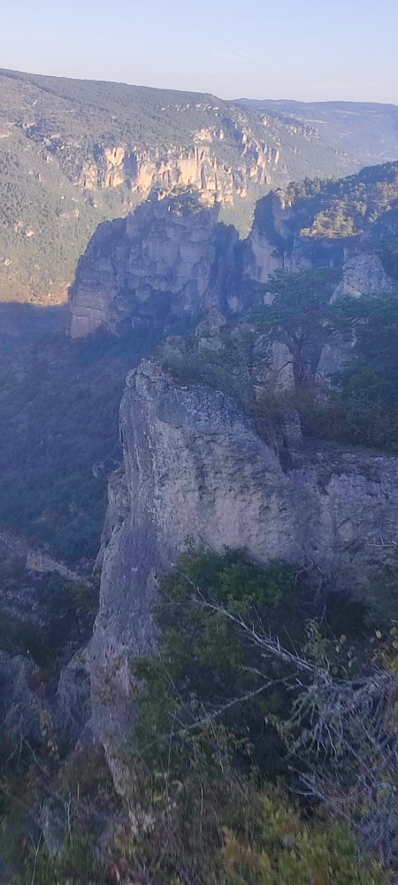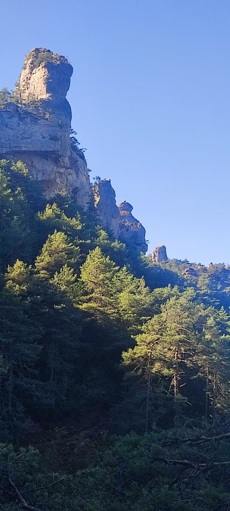 Ce matin, nous nous engageons sur un sentier en corniche au-dessus des gorges du Tarn.