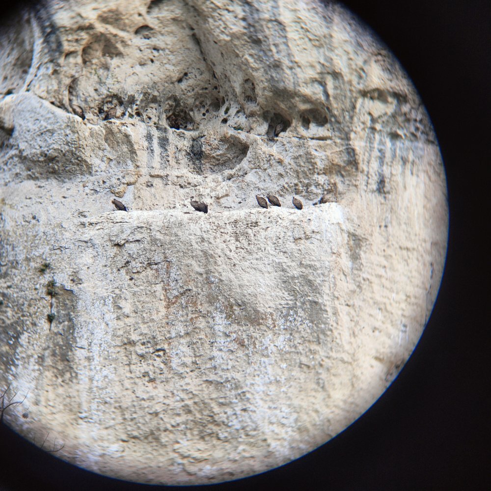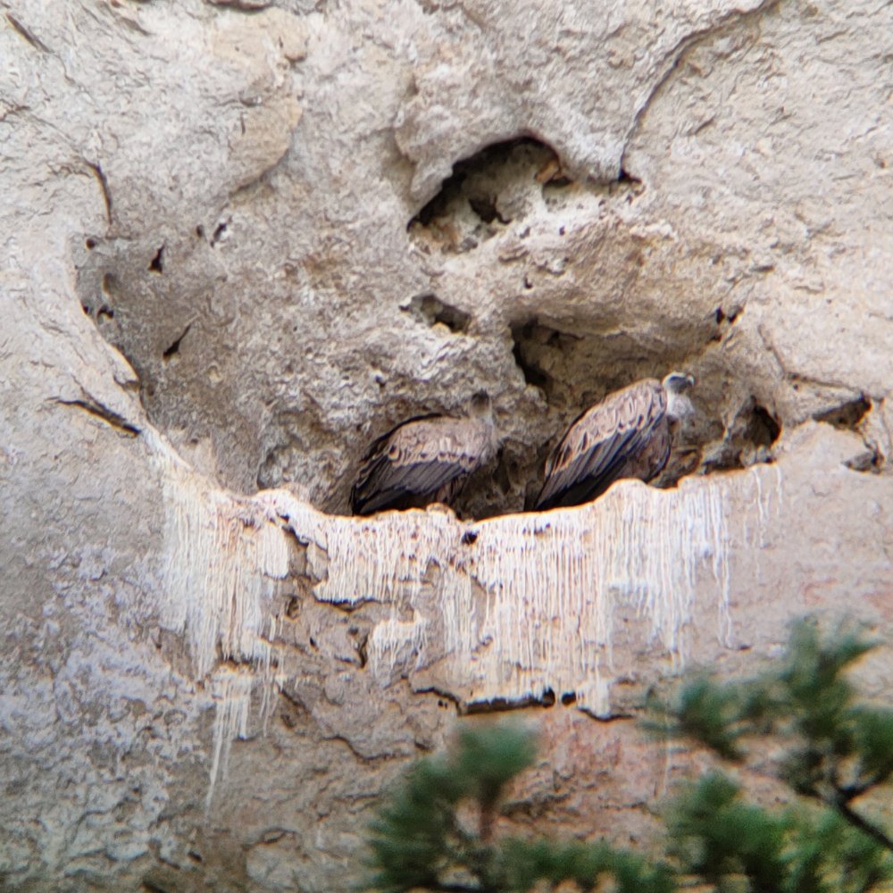 Face à nous, une falaise s’érige imposante et que devine-t-on dans un surplomb ? Une équipe de vautour fauve qui attend que la température s’élève pour tournoyer dans les airs.