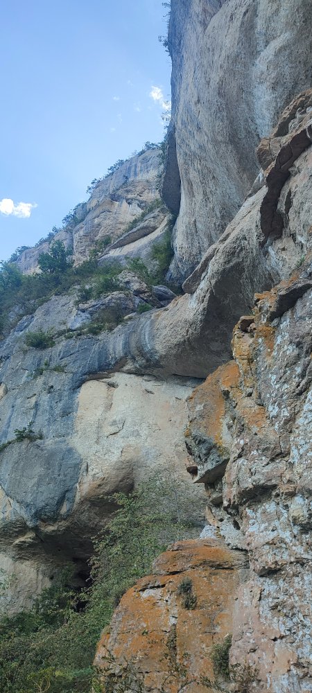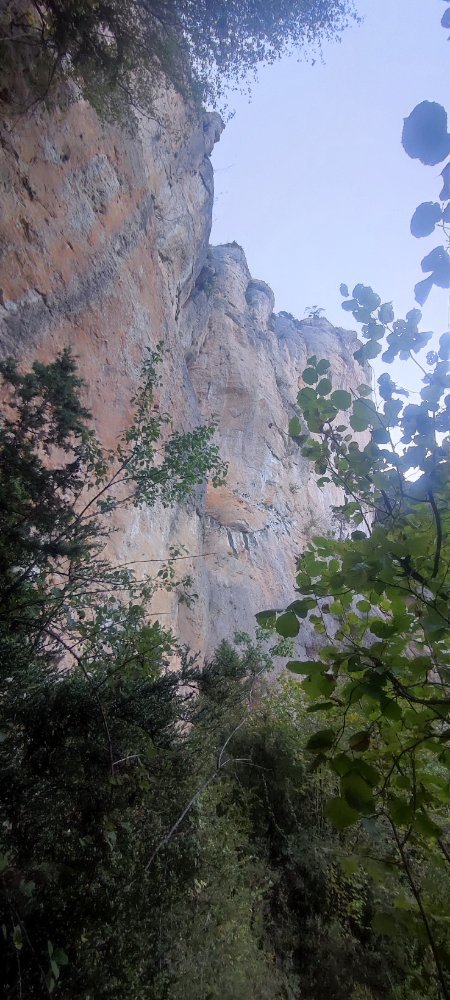 En longeant ces falaises qui sillonnent dans une forêt où se mêle le pin, le chêne, le buis, le geai prévient de notre arrivée et le pic noir s’envole dans son cri bien particulier ; quelques mésanges se chamaillent dans un arbre, c’est l’orphéon de la nature.